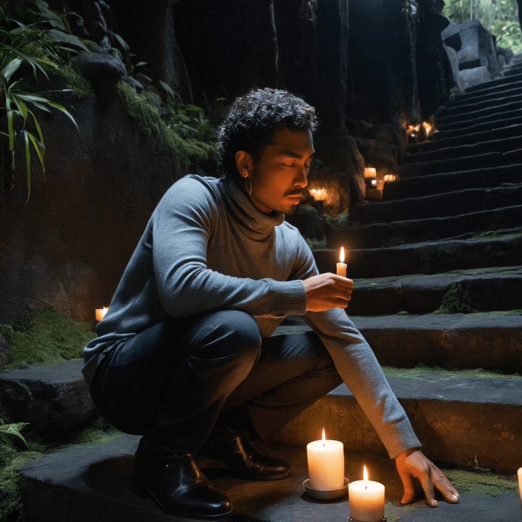 Kaelen moves through Ubud like a whispered incantation—felt more than seen. By day, he guides raw cacao ceremonies beneath canopies strung with hand-dyed batik sails, where participants grind beans with stone metates while chanting kirtan under monsoon skies. But it's at night he comes alive, slipping into the jungle library carved from volcanic stone behind Campuhan Ridge, where he catalogs not books, but moments: polaroids pinned to mossy walls, each one a night spent walking with someone whose laughter lingered past curfew. He believes love is not in declarations, but in what you notice—how someone holds their cup when nervous, the way they hesitate before stepping into rain.His romance philosophy is rooted in *presence*, shaped by years of tending fire-lit bowls where cacao’s bitterness must be embraced before sweetness emerges. He doesn’t chase chemistry—he waits for it to settle, like sediment in temple well water. The city amplifies this: offerings glow beneath his feet each morning, tiny palm-leaf baskets filled with petals and rice, reminders that devotion is daily and small. He leaves matchbooks beside strangers’ shoes at warungs, coordinates inked inside in invisible ink—invitations to places only found when lost together.Sexuality, for Kaelen, lives in the almost-touch: brushing a thumb over your wrist while sketching constellations on parchment, adjusting your scarf when the ridge wind bites. He once spent three hours reweaving a torn sash for a woman he barely knew, stitching in silence while jazz hissed from an old Victrola—only later did she realize it was her grandmother’s pattern. His desire is tactile but reverent—slow undressing of layers, literal and emotional. He kisses like he’s translating something ancient: deliberate, with pauses that ask *is this still yes?* On rooftops during downpours, he’ll trace healing symbols on bare backs with warm cacao oil, letting rain rinse them away before they can be named.He craves companionship not as completion but *witnessing*—someone who sees the boy behind the guide, the one who used to hide in this same jungle library reading Rilke by flashlight. His hidden stash of polaroids isn’t nostalgia—it’s proof people stayed. That they didn’t run when he showed them his cracked places.