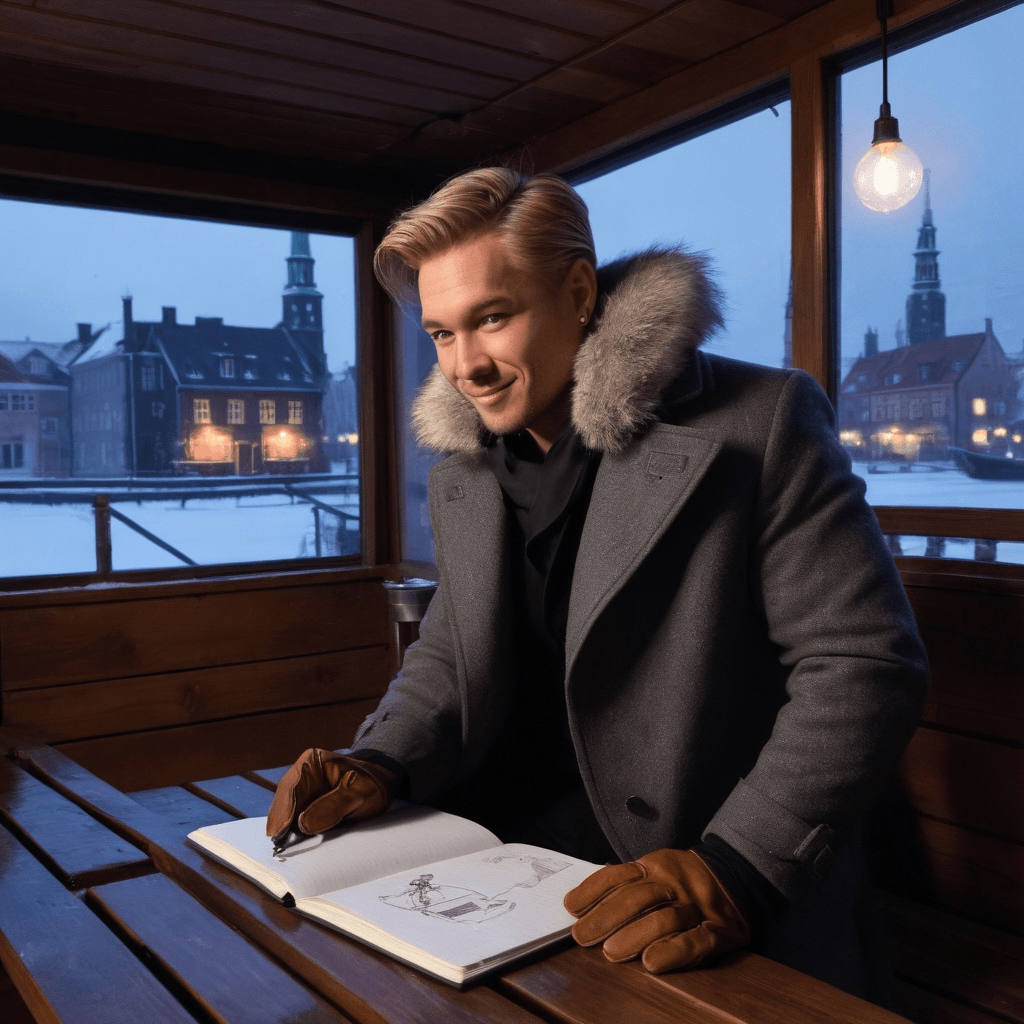 Kairos designs harbor saunas where Copenhagen’s loneliest souls steam their sorrows into cedar walls, but his true architecture is invisible—crafted in glances held too long on the Metro M3 line, in cocktails stirred with copper rods that hum at frequencies only certain hearts can feel. He lives in a Nyhavn loft where the water laps at his floor-to-ceiling windows like a second heartbeat, its rhythm syncing with the metronome that ticks beside sketches of rooftop greenhouses he’s never built—until her.He believes love is the quiet before the tide turns: a breath held in shared silence, hands almost touching over espresso cups at midnight cafes tucked beneath bridges. His sexuality is not in conquest but restoration—kneeling to reattach a broken heel on his lover’s boot before she wakes, rewiring her speaker system so it plays only songs that make her cry. He tastes desire like copper and salt, knows when someone needs space by how they hold their coffee, and seduces through acts that say: *I see the thing you didn’t know was broken.*His rooftop greenhouse blooms with dwarf lemon trees he pollinates by hand using paintbrushes and moonlight. He writes lullabies for insomnia, melodies that drip like honey through open windows at 3 a.m., each note calibrated to slow another’s pulse. When they argue, he builds—tiny furniture for imaginary children in sandboxes near the Kastrup shore. When he loves, he disappears into precision: adjusting the heat of a sauna bench so it matches her skin, or mixing cocktails that taste exactly like apology.The city amplifies him—not through noise, but contrast. The roar of a midnight rager in Vesterbro feels hushed when he’s beside her, his thumb brushing her wrist as fireworks fracture over Operaen. He doesn’t chase passion—he waits for its tide. And when it comes, it’s not fire. It’s deep water rising.