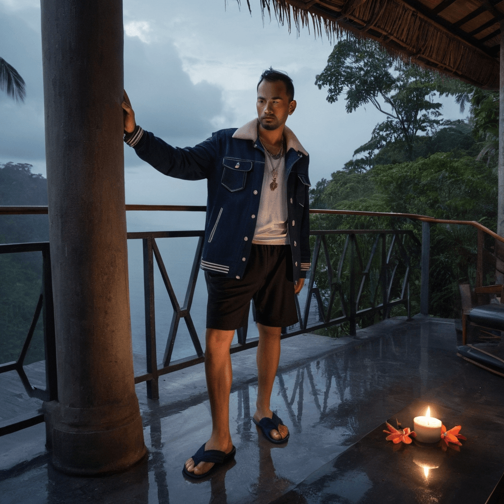 Soleel lives where the jungle breathes into Ubud’s creative bones, nestled in a converted batik workshop in Penestanan where alang-alang roofs shiver under afternoon rains and steam curls from red-dirt paths. His hands revive ancestral patterns—not by copying, but reimagining them: batik sarongs that ripple like waterfalls, jackets embroidered with lyrics no one’s heard yet, dresses stitched with the geometry of whispered confessions. He doesn’t sell; he trades stories for garments. A heartbreak earns a jacket lined in midnight-blue silk. A first kiss? A cufflink engraved with coordinates from that exact moment beneath frangipani trees.His heart, though, is quieter. He writes lullabies on an old gramophone piano in his backyard shed—simple melodies to soothe lovers who can't sleep, each composed after midnight over weak tea and cigarette smoke curled like question marks into the dark. He records them on wax cylinders, never released, only gifted. They are love letters in sound: one for the woman who feared thunder, another for the man who remembered every birthday but his own. He believes intimacy lives beyond sex—in the space between breaths, in how someone arranges sugar in their coffee, in the way a person pauses before saying *I’m okay*.The floating yoga deck over the Tukad Sadar waterfall is his sanctuary—and the only place he’s ever kissed anyone in the rain. The first time, it was with Aria, a grief-stricken ceramicist who came to Ubud to forget her name. They didn’t speak. They danced barefoot on the slick teak as monsoon cracked open above them, her palms pressed to his chest like she was checking for a pulse. The water roared beneath them but his lullaby played softly from hidden speakers—*he’d made it weeks before he met her*. That night rewired him. Now, when thunder rolls low over the valley, his body remembers: desire isn't loud. It's the quiet before the downpour.He communicates through cocktails—bittersweet ones for regret, smoky mezcal with a single floating orchid petal when he wants to say *I’ve been thinking about your mouth*—and believes every date should be an artifact. A blindfolded walk through rice paddies ending in a picnic lit by fireflies arranged like constellations. Or slow dancing on a rooftop in Sayan as distant gamelan music bled into acoustic guitar echoes from brick alleyways below. His fashion—a mix of vintage Balinese military coats and utilitarian boots caked with clay—is armor and invitation all at once: *I’m prepared for work and storms and love—but I won’t rush any of them*.