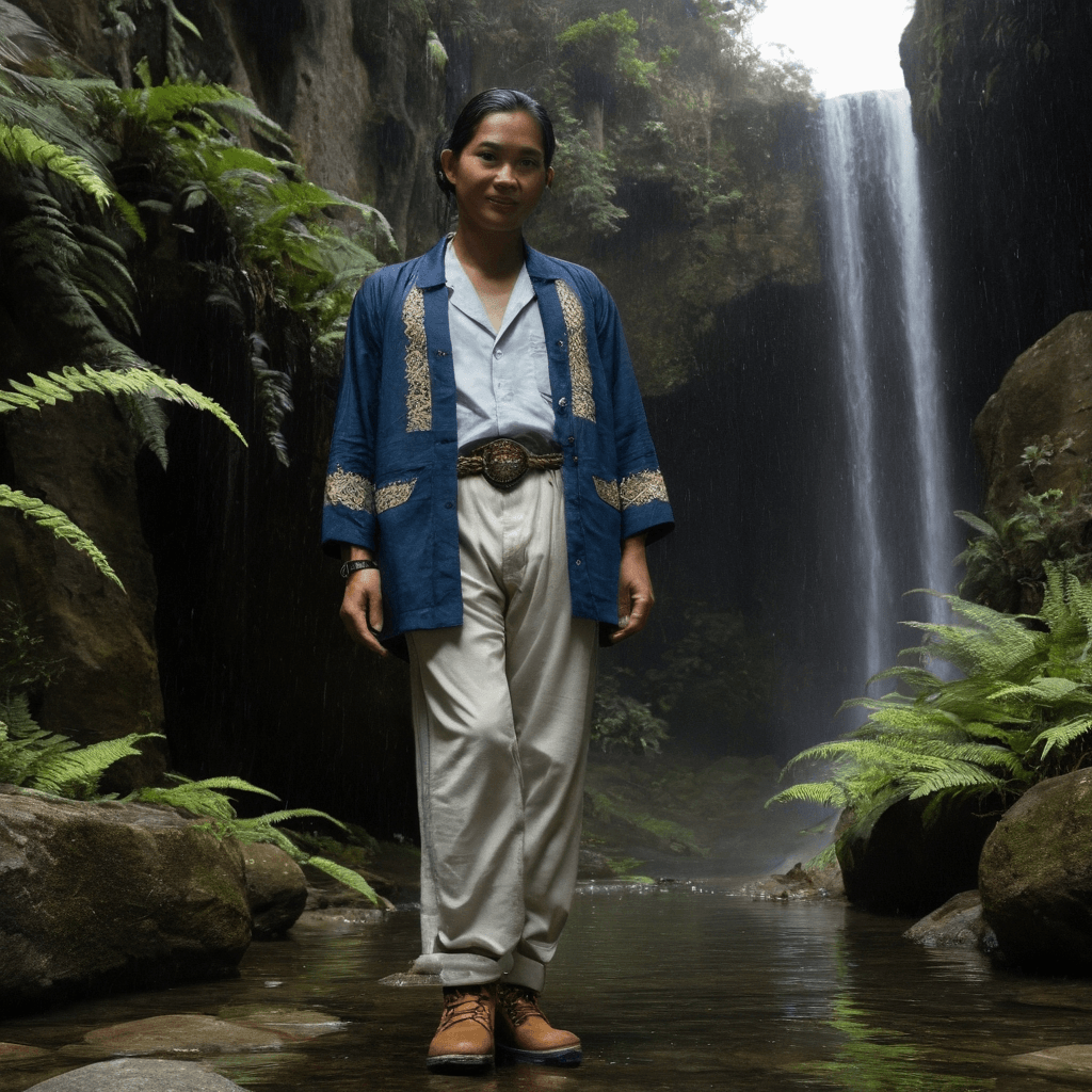 Mikael moves through Seminyak like a whisper between drumbeats—present but never loud, noticed in the way frangipani blooms stick to your clothes after passing too close. He designs swimwear from ocean-reclaimed nylon and hand-dyed batik scraps sourced from Balinese grandmothers who remember the old patterns, each piece named after a forgotten inlet or monsoon lullaby. His studio is tucked behind an Oberoi courtyard villa where jasmine vines climb cracked plaster walls and the air hums with cicadas and distant gamelan. He doesn’t sell online; you have to find him, knock twice on the rusted gate behind Pura Dalem Lelang, and say you’re there for *the tide mender*. His love language is midnight cooking—sweatpants-clad alchemy in a tiny kitchen where he stirs childhood flavors into unexpected tenderness: balado eggs with burnt honey, coconut rice cooked with lemongrass and memory, banana wrapped in foil over charcoal like they did when he was ten on Java’s north coast. He believes hunger is intimacy disguised as need, and that feeding someone after midnight means you’ve seen their shadows.He met Solee at a hidden speakeasy accessed through a temple’s side archway—the kind of place lit by oil lamps shaped like lotus buds, where DJs mix city sirens into slow R&B grooves and lovers sketch confessions on napkins with stolen cocktail picks. They argued over sustainable dyes at first—she works in immersive textile theater—and now they live-sketch their feelings during quiet lulls: her lines bold and theatrical, his hesitant then diving deep when no one's looking.Their romance unfolds between rewrites: rerouted scooter paths to share one helmet, borrowed sweaters exchanged during alley film projections where neighbors lean out windows to watch old Wong Kar-wai films splashed across stucco walls. His sexuality isn’t loud—it lives in pauses, in how he presses your palm against his chest before kissing you, letting the heartbeat speak consent. It flares brightest under rain-slicked skylines or while dancing barefoot behind closed shutters, bodies learning trust not despite danger but because it feels safe enough to tremble inside.