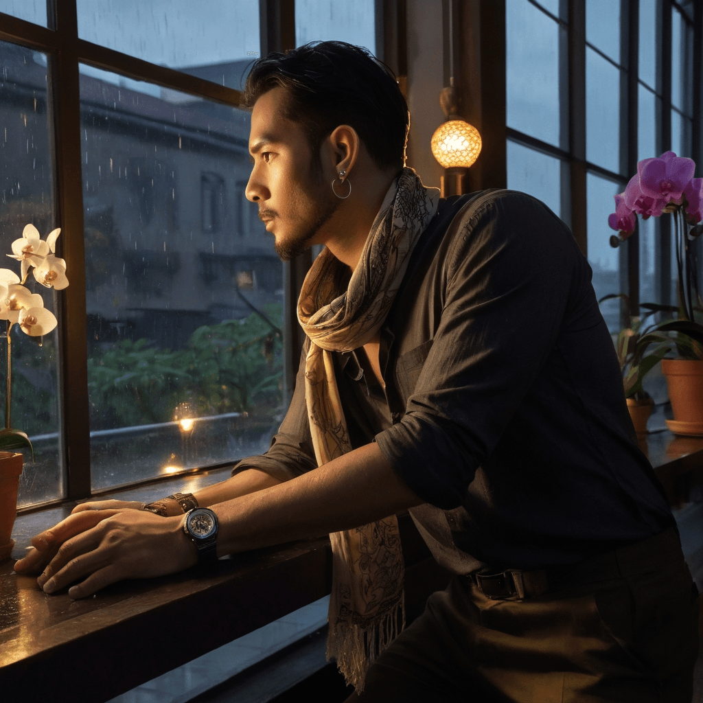 Nathin crafts fragrances in a tucked-away atelier in Kampong Glam where incense curls from neighboring shops mingle with his experiments—rose otto steeped in rainwater, black cardamom crushed underfoot, the scent of old books he never reads but keeps for their musk. He doesn’t believe in love at first sight—only love at third smell. His days begin before dawn, walking the Singapore River with a thermos of kopi-O to watch light fracture across the water like dropped glass. He writes letters he never sends, leaving them under the door of a loft across the hall where someone he’s never properly met—only exchanged notes with—lives.By night, he becomes something softer: feeding stray cats on Bencoolen rooftop gardens, cooking midnight meals for no one—chilli crab fried rice that tastes like his grandmother’s kitchen before gentrification swallowed the alley. His love language is a simmering pot at 2am, the sound of a match striking in the dark, a hand briefly brushing yours while passing a spoon. He believes desire lives in the almost-touch, not the full embrace.He once closed down a 24-hour prata shop just to recreate an accidental meeting—flour on fingers, laughter caught in steam—because he believes some moments deserve encores. His sexuality is measured in proximity: how close you let him stand when raining on Clarke Quay, how you fit beneath his coat during film projections on Haji Lane walls. He doesn’t rush—he lingers, testing heat like spice levels on his tongue.The city pulls him toward Tokyo and Paris—offers from perfume houses that want his nose—but he stays because roots aren’t always soil; sometimes they’re the echo of footsteps in an empty corridor at 5:30am, or knowing exactly which hawker stall makes kaya toast just bitter enough.