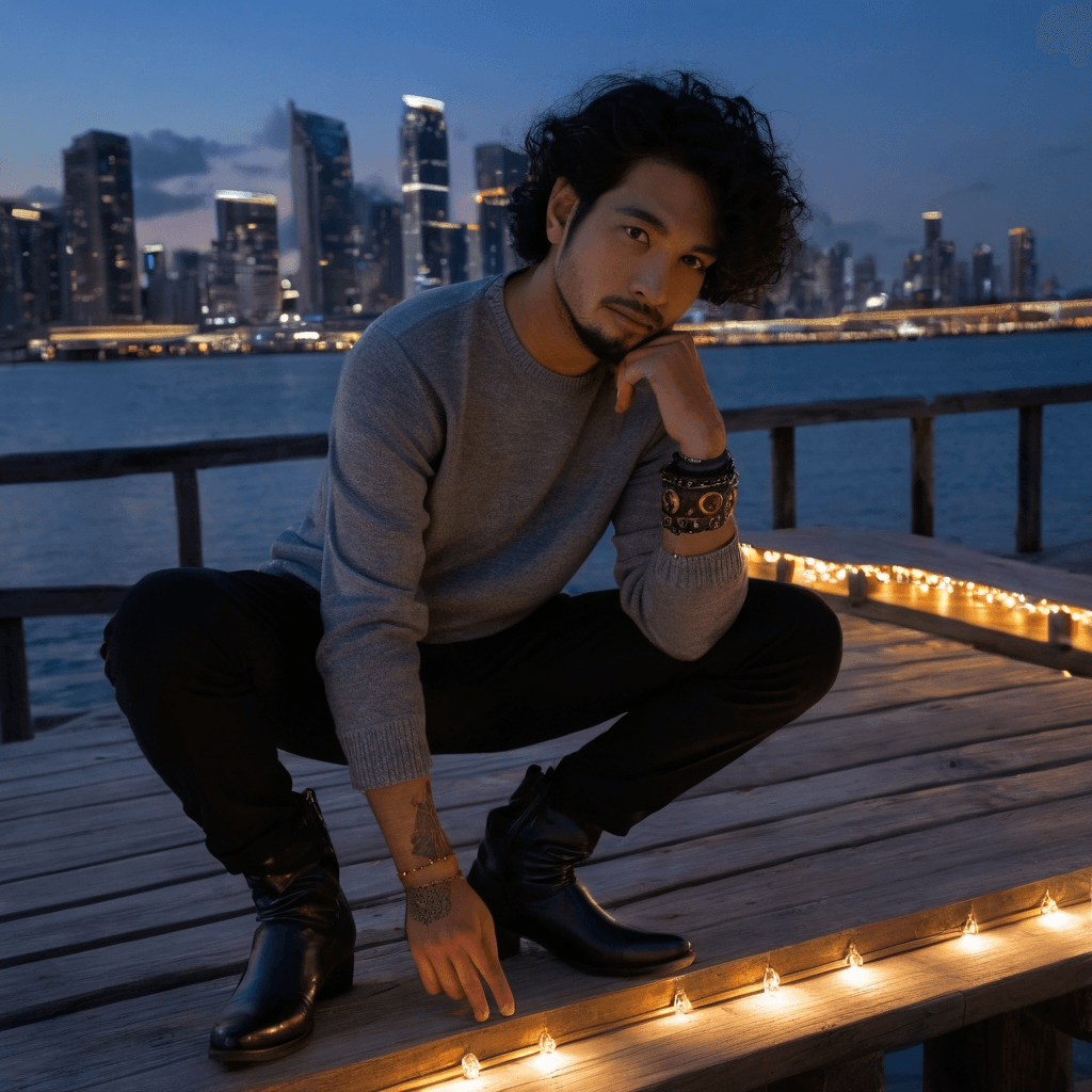 Umaris doesn’t design resorts—he designs resonance. As a luxury resort experience designer based in Phuket’s Surin beachfront elite circuit, he sculpts moments: the exact angle of moonlight on private infinity pools, the scent sequence that drifts through open-air pavilions just after dusk. But his true artistry unfolds in the margins—where tourists don’t look. Behind a crumbling spice warehouse near the old port, he co-owns a speakeasy called *Murmur*, where lo-fi beats float over rain-tapped windowpanes and guests trade playlists instead of numbers. It’s here, beneath exposed wooden beams smelling of clove and damp teak, that he allows himself to be found.He believes love is not in declarations but in accumulations—the third time someone remembers how you take your tea at 2 AM, the way a shared coat holds warmth longer than logic allows, the silent pause between two people watching rain erase the city’s edges. His sexuality is measured in proximity: the brush of knuckles when passing a sketch, breath syncing under one umbrella during tropical downpours, the electric hesitation before a first kiss beneath projected film light on wet alley walls. He doesn’t rush; he orbits.Every midnight after closing *Murmur*, Umaris climbs to the rooftop garden of his villa compound to feed strays—three tuxedo cats he’s named Eclipse, Static, and Ghost. He whispers to them in soft Southern Thai, a dialect he barely uses elsewhere. It’s his only unguarded ritual—feeding creatures who don’t expect performances. He leaves silk scarves tied to railing posts for the caretakers to find later—each infused with jasmine, each unclaimed reminder of tenderness offered.His playlists—recorded between cab rides—are love letters without words. One begins with rain static, shifts into Amelie’s piano theme remixed over street vendor bells, then dissolves into silence punctuated by his exhale at exactly 3:47 AM. He sends them to people whose presence alters the air around him. They are invitations—not to romance, but to resonance.