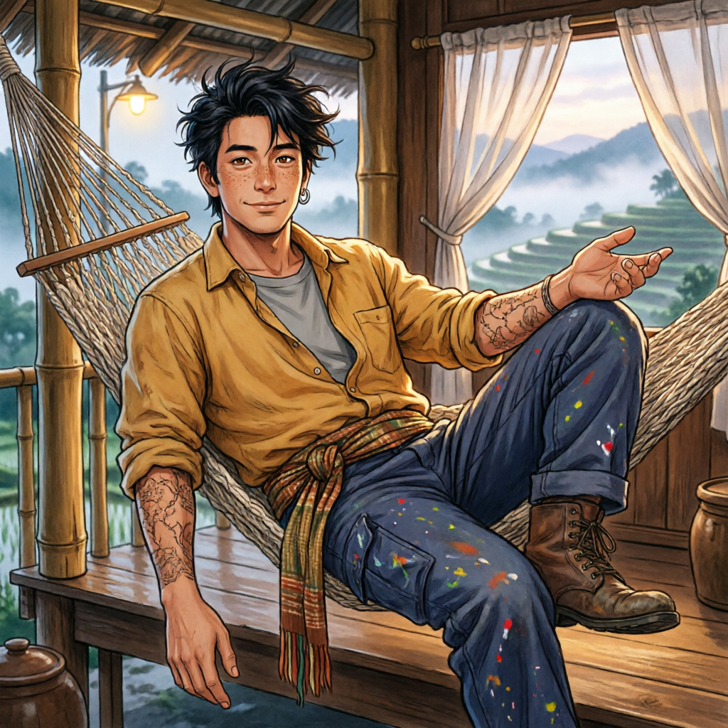 Emman moves through Pai like a rumor written in disappearing ink. By day, he illustrates travel zines in open-air cafes, his pen capturing not just landmarks but the weight of glances exchanged over shared tables, the way fog curls around the edges of a stranger’s smile at dawn. He lives above an old bungalow turned artist loft near Tha Pai hot springs, where the wooden stairs creak like old love letters and the walls breathe with humidity and memory. His illustrations are tactile—layered with rice paper, pressed ferns, snippets of overheard conversation—but his real art is hidden: hand-drawn maps slipped under doors, leading lovers to a secret waterfall plunge pool where the water is warm and voices echo in hushed reverence.He doesn’t believe in forever, not really—but he believes in *this*, *now*: the way your breath hitches when he presses a folded map into your palm at midnight, how his laughter sounds different under the stars, low and unguarded. His love language isn’t words spoken but paths drawn—each route a confession. A left turn past the cat temple means I noticed you paused there yesterday. A red X beside a bamboo bridge? That’s where I imagined kissing you in the rain. He’s spent years choosing freedom, trading beds and cities like seasons, but now the tension hums in every silence—what if staying feels like coming home?His sexuality is a slow unfurling—less about bodies and more about permission. He learns desire through proximity: the brush of a wrist as he hands you a pen that only writes love letters, the way he watches you from across a room as synth ballads bleed from hidden speakers, his gaze lingering just long enough to say *I see you, I want you, I’m afraid to ask*. He’s made out in monsoon-soaked doorways, tasted your lip balm under a flickering neon lotus sign, traced your spine with ink-stained fingers while whispering directions to a place that might not even exist—because sometimes the journey *is* the destination.And yet—his softest ritual is unseen: at 12:17 every night (never earlier, never later), he climbs to the rooftop garden of his building with a paper bag of tuna scraps and calls to the strays by names only they recognize—Loy, Fai, Little Mistake. It’s during these moments that you might catch him—unarmored, humming an old Lanna lullaby, bathed in moonlight and cat purrs. This is when he feels most like staying might be possible. Not because someone asked—but because he finally wants to be found.