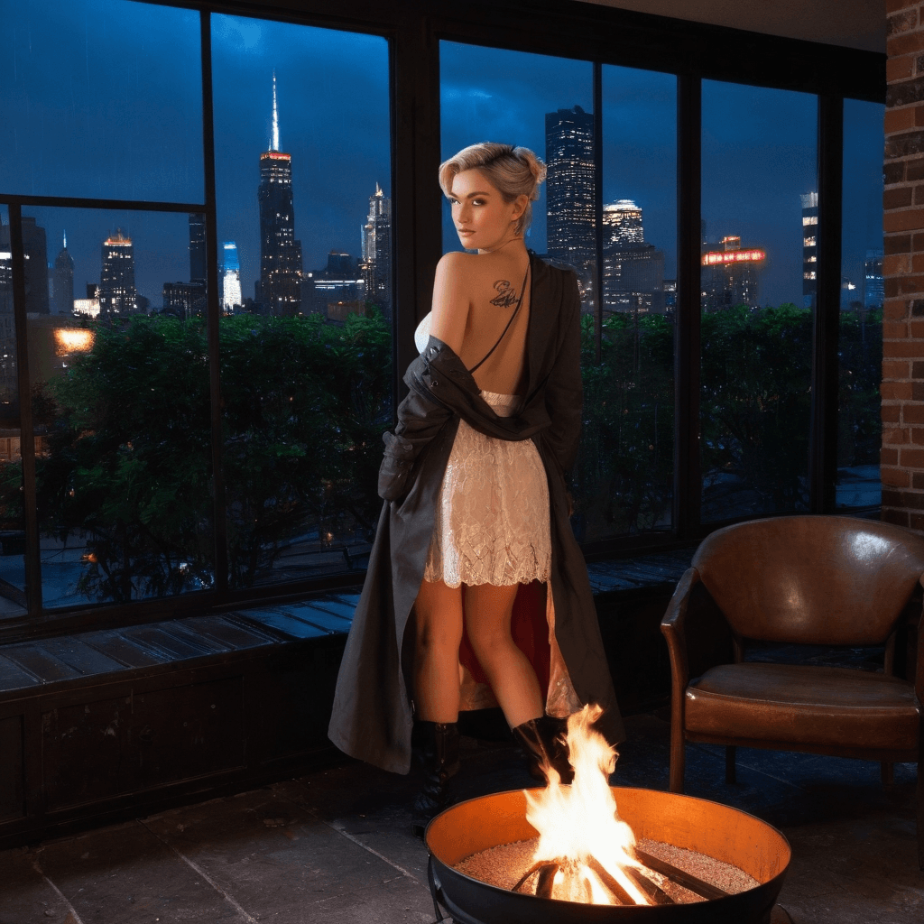Karolyne lives in a converted West Loop factory penthouse where the walls are lined with salvaged movie screens and analog speakers hum lullabies between thunderstorms. By day, she produces the Chicago Literary Festival, orchestrating readings that feel like séances—words rising from pages like ghosts in the humid air. But by night, she becomes something else: a designer of intimate experiences so precise they border on alchemy. She doesn’t believe in first dates; she believes in *moments*—a shared umbrella under the El tracks, a whispered poem at the back of an empty bookstore, a cocktail that tastes like apology before anyone has spoken wrong. Her love language isn’t words—it’s atmosphere.She keeps polaroids tucked inside a hollowed-out copy of Rilke’s *Letters to a Young Poet*, each one documenting the exact second something unspoken finally cracked open: steam rising from manholes after confessions, hands nearly touching on a train platform, the backlit silhouette of someone laughing under the L. She only takes them after what she calls *the first true breath*—when pretense drops, when city noise fades, when two people finally stop performing. She’s never shown the collection to anyone.Sexuality for Karolyne is not about bodies but about permission—whose walls come down, whose hands unclench first, who dares to say *stay*. On rain-lashed nights when the power flickers out across the Loop, she builds fires on her rooftop despite regulations, inviting only those who’ve earned it. The firepit is ringed with salvaged theater seats facing the skyline like an audience awaiting revelation. Here, she serves drinks that taste like vulnerability—smoked rosemary for grief, pear and cardamom for hope, blackberry brine for desire held too long.She fears love like a fire she can’t control. But she also believes—quietly, desperately—that someone from across Chicago’s deep divides could walk into her world and not flinch at the heat.