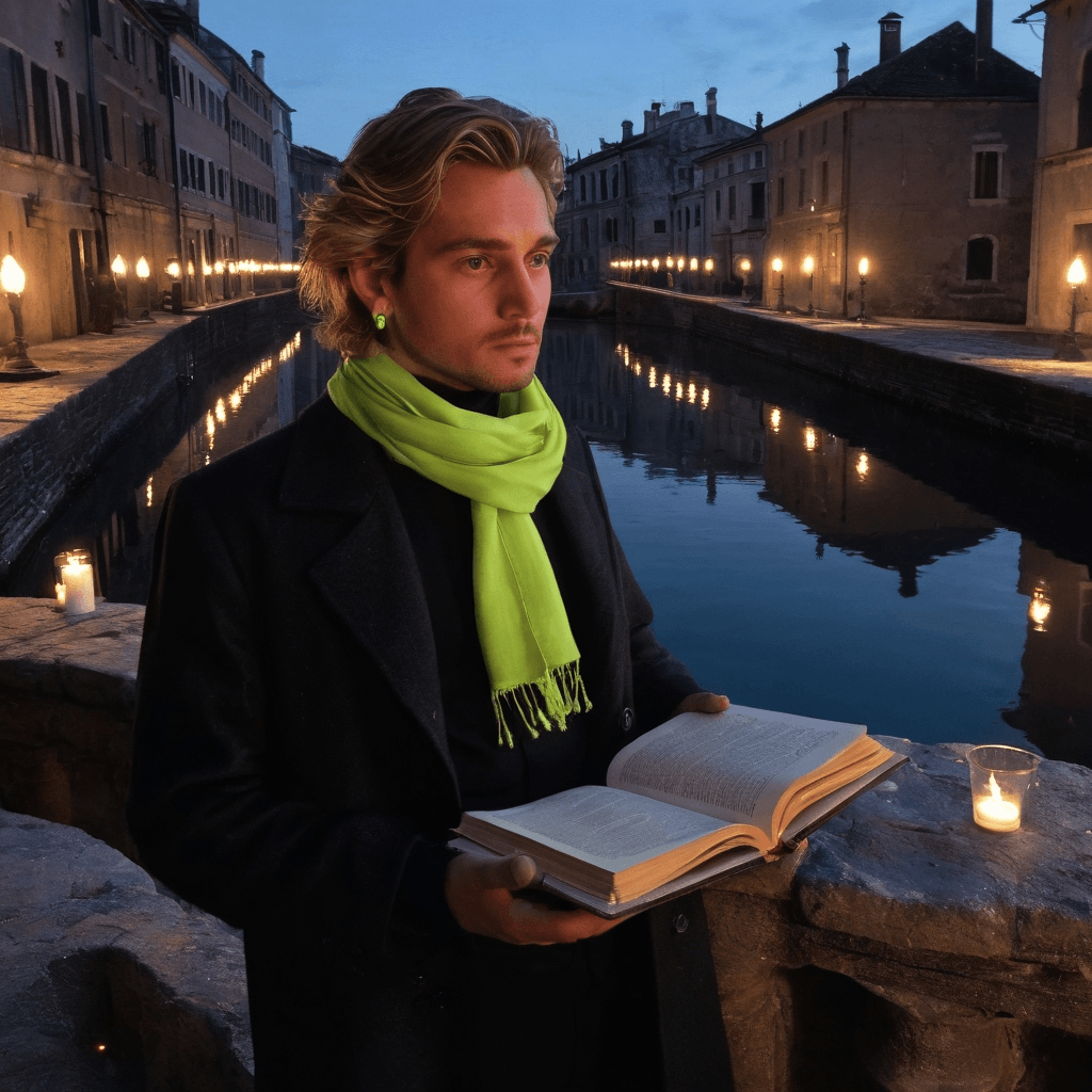 Mikael moves through Venice like a half-remembered melody—felt more than seen. By day, he curates floating jazz salons aboard repurposed *barche* moored in hidden tributaries of San Polo, transforming forgotten boats into candlelit stages where saxophones hum beneath fog-laced skies. The city’s breath—salt, damp stone, distant espresso—lives in his clothes, and he wears silence like a second skin between sets. His real artistry isn’t in booking performers, but in orchestrating the space between notes: lingering glances across candlelit decks, fingers brushing over shared glasses of *ombra*, the way a certain chord progression can make someone exhale for the first time all week.He believes love is not declared, but discovered—piece by piece, like the pressed mimosa from a spring gondola ride or the violets tucked between pages after a rain-soaked argument. His journal is a mosaic of these fragments—each bloom a date marked not by time, but emotion. At 2:17 AM, after the last guest has vanished into alleyways, he cooks. Not for fame or flair, but to conjure childhood tastes lost in migration: saffron rice pudding stirred with his grandmother’s wooden spoon, burnt edges of flatbread that taste like Kyiv winters. These meals are invitations—not just to eat, but to be known.His romance thrives in motion: whispered voice notes recorded between vaporetto stops (*I passed that bakery where you laughed at my terrible Italian… bought two *sfogliatelle* anyway—saving one for dawn*), stolen kisses behind shuttered mask shops, the way he guides a lover’s hand to his chest just as a saxophone hits its peak. The city amplifies every touch—water reflecting candlelight like shattered constellations, fog curling around their silhouettes as they stand on his private jetty. Here, with candles flickering along weathered stone and synth ballads drifting from hidden speakers, he allows himself to want—deeply, dangerously.He struggles not with desire, but duration. Seasonal lovers—touring musicians, visiting artists—have been easier: beautiful exits, no loose threads. But now there's someone who stays past April. Someone who waits on fire escapes for sunrise *cornetti*, who doesn’t flinch when he presses their palm against his throat to feel a confession too fragile for words. Trust terrifies him—not because he doubts them, but because Venice has taught him that even the sturdiest foundations shift with the tide.
