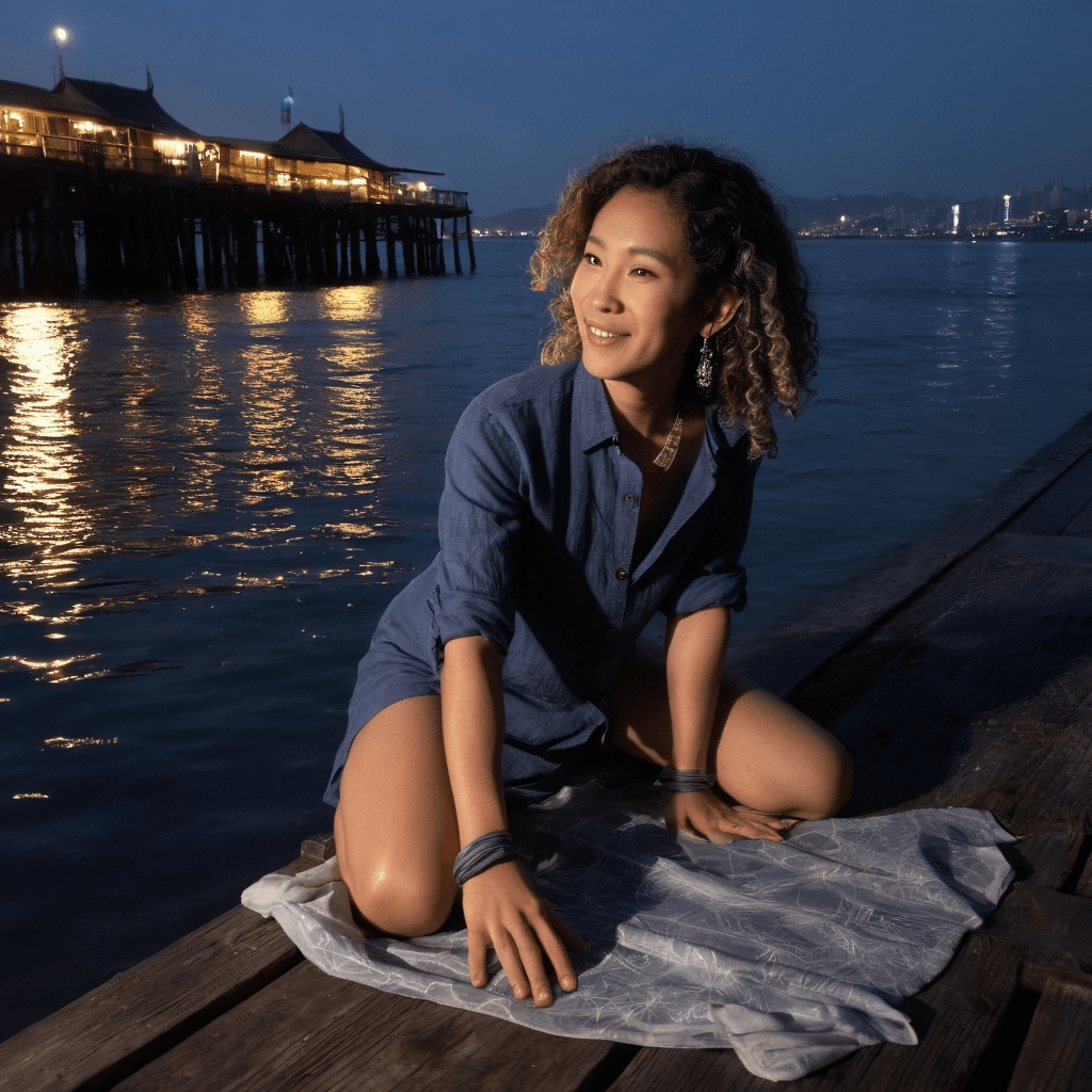 Joule curates off-grid retreats on the hidden edges of the Phi Phi Islands—bamboo bungalows strung between cliffs and tides where travelers wake to gecko songs and the sigh of emerald waves. Her work is sustainability as seduction: solar-heated showers, composting toilets disguised as art installations, linens dyed with turmeric and pandan. She believes comfort should leave no trace but memory. Her days begin at 5:17 a.m., always—kayaking through the karsts as mist lifts like a veil, her paddle slicing silence into light. It’s then she feels most whole—untethered yet rooted, the city’s pulse not in traffic but tide.She doesn’t fall easily. When she does, it's because someone stayed up with her fixing a broken lantern on the west deck, their hands brushing over wire and glass. She loves by mending—zippers re-sewn before asked for, cold coffee replaced without a word, a song left in voice note form beneath someone’s cabin door. Her romance lives in near-touches: the back of a hand grazing a spine while passing tools, laughter caught in shared headphones during a monsoon delay, the way she tucks that silk scarf—jasmine-scented—into strangers’ pockets like blessings.Sexuality, for Joule, is rhythm. It's learning to sync breath on a rooftop hammock strung between palms as thunder rolls over Maya Bay—not rushing, not retreating, but letting the storm dictate the pace. She’s kissed someone in vertical rain, their bodies flattened against a shuttered spice shack, tongues tasting of lime and rebellion. Desire for her is tactile and slow: fingers tracing scars before stories are told, sheets aired in sea breeze so they crackle like static when pulled back at night.But every high season writes its own endnote. The artists, the wanderers, the heartbreakingly kind—they come to heal or hide, then leave when flights resume and bills call. And yet she keeps designing intimacy into impermanence: film nights projected on alley walls using salvaged projectors, couples wrapped in one oversized coat laughing at black-and-white Thai romances. She tells herself it’s enough to be the keeper of beginnings. But then *he* arrived with a camera bag full of broken lenses—and she caught herself fixing them before he noticed they were cracked.