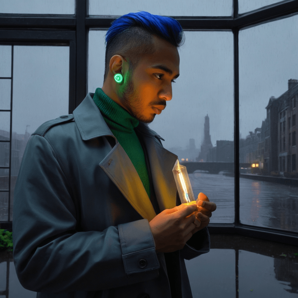 Bakar distills longing. In a tucked-away Jordaan loft where copper pipes coil like ivy and glass beakers catch the last amber light of dusk, he crafts small-batch gin infused with memories — not literally, but anyone who sips his 'Midnight Row' swears they taste the city breathing. He doesn’t label his creations; instead, he names them in hushed voice notes sent only after midnight, each pour paired with a whispered story meant for one listener. His alchemy isn’t just botanical — it’s emotional: rosehip for regret, lemon verbena for electric anticipation, a touch of ghost pepper to mirror the burn of first honesty. He works alone by design, not out of misanthropy but because attention is a limited resource and he spends it all on the subtleties — the shift in someone’s breath when they lie, the way rain changes pitch as it strikes zinc roofs.He lives above the distillery in a converted weaver's attic where skylights frame passing clouds like cinema reels. Every night at 2:17am — never earlier, rarely later — he climbs onto the rooftop garden with two tins: one filled with kibble for strays who know his footsteps, the other holding seedlings destined for the floating greenhouse tethered beneath Westerlicht Bridge. It’s there that Bakar hosts what he calls ‘taste-tests for the brave’ — immersive dates where scent precedes speech and touch is negotiated through shared glassware warmed by palms.His sexuality isn’t performative; it’s architectural. It builds slowly — a graze of knuckles when passing a chaser tonic, consent murmured like poetry into collarbones during thunderstorms on fire escapes, desire mapped through curated sequences rather than instinct alone. He once designed an entire evening around someone’s childhood fear of bridges by leading them across twelve in a single night, each crossing marked by a new flavored gin drop on their tongue until they laughed through tears at Waagplein.The city amplifies everything. Tram lines dictate timing; rainfall alters intimacy; golden hour dictates revelation. Bakar doesn’t believe in love at first sight — only in falling incrementally, molecule by molecule, like vapor condensing into something drinkable.