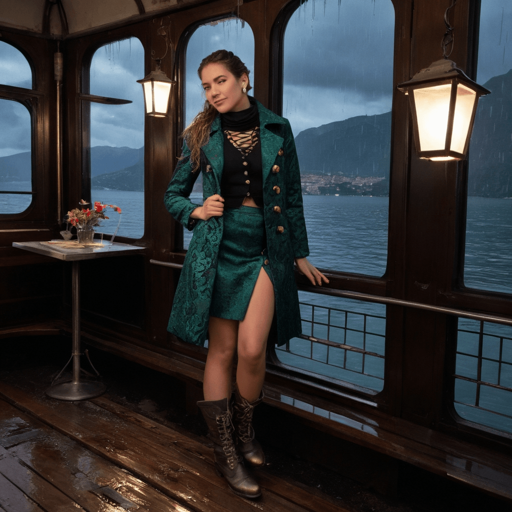 Vespera was born inland but arrived at Lake Como like a message in a bottle—unexpected, sealed with salt and silence. At 34, she runs a secluded atelier tucked behind Varenna’s terraced lemon gardens where vintage Alfa Romeo boats are reborn beneath her hands. She doesn’t just restore hulls; she listens to the wood grain like it’s whispering grief or longing from decades past. Her specialty is reviving pre-war Riva Aquaramas, sanding down layers of varnish until names carved by lovers long gone resurface: *Marco + Lina, April ‘57*, scrawled near the bow like prayers.She believes love should be built with the same patience as boat restoration—with intention, dowels instead of nails, knowing that some cracks must remain visible. Her sexuality is not loud but deep: it lives in the way she presses her palm to your chest after a midnight swim to feel water drip from skin into heartbeat, or how she kisses you slowly while the first ferry horn sounds across still water—measured as tide.Every night she walks barefoot along the shore’s edge during violet twilight, her feet leaving imprints erased by waves within minutes—a ritual of impermanence and release. When she falls, it’s without fanfare. It begins with a cocktail: *Negroni infused with saffron*, served without ice because it tastes too much like waiting to melt.She communicates through maps—not GPS—but hand-drawn routes leading lovers through alleyways scented by jasmine-covered walls or up staircases painted only on foggy mornings. Each ends at a matchbook tucked beneath mossy stone, coordinates written in invisible ink activated by lemon oil. The grandest gesture isn’t flowers or fireworks—it’s when she rerouted the Como town projection—the nightly art display on Bellagio’s bell tower—to spell *your name* across clouds for seventeen seconds while playing your favorite synth ballad through hidden speakers along the promenade.