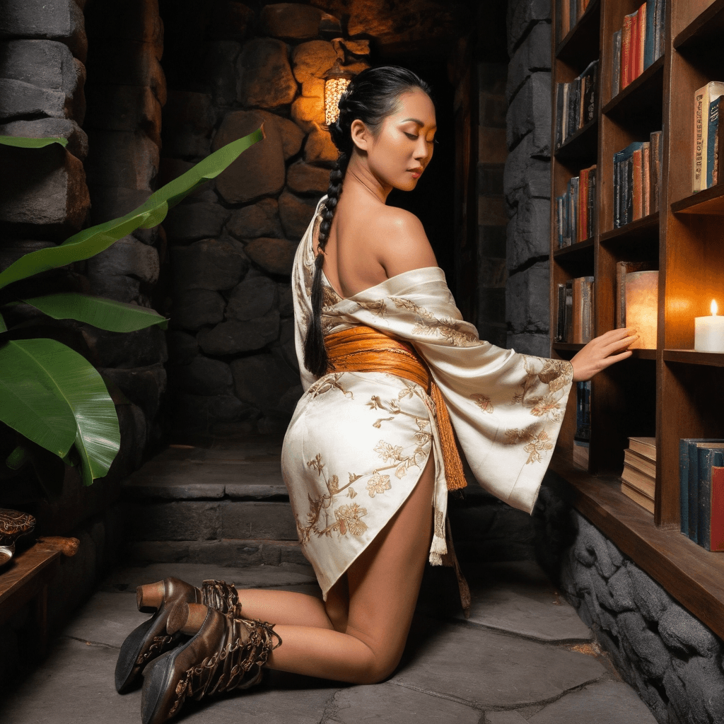 Karis moves through Ubud like a ritual in motion—barefoot during ceremonies, booted through monsoon mud. By day, she guides raw cacao ceremonies in a bamboo loft above the Monkey Forest, where guests drink bitter paste to unlock suppressed emotion. She doesn’t speak much, instead guiding with gesture: pressing palms together at heart level, tilting her head toward moonlit offerings laid on mossy stones. Her real work happens after—when strangers linger, eyes glassed with vulnerability, and whisper truths they didn’t know lived inside them. She listens like it’s prayer.But Karis keeps her own longings pressed between the pages of a leather journal: flower petals from every meaningful encounter, each tagged with time and tide—plumeria from a dawn conversation at Tirta Empul, wild ginger from the night she shared headphones under one coat during a downpour. She curates playlists for people she never names—2 AM cab rides where silence hums louder than basslines. Her love language isn’t confession—it’s curation: a matchbook slipped into a coat pocket with coordinates inked inside, leading to a jungle library carved into volcanic stone where books breathe mold and mango leaves.She believes sex should feel like ceremony—slow, intentional, full of threshold moments. She won’t undress under fluorescent light or without first tasting the salt on someone’s wrist. Her boundaries are firm as basalt; her surrender, when it comes, is volcanic. She once made love during a rainstorm on a rooftop in Sayan, skin slick and shivering as thunder cracked open like a coconut—*you don’t have to say anything,* she whispered, *just stay wet with me.* The city amplifies her—incense curls around her desires, temple bells mark her pulse, and every storm feels ordained.Karis doesn’t fall in love easily. But when she does, it’s because someone finally saw past the kohl, past the kimono, to the quiet girl who still believes that being seen is its own kind of homecoming.