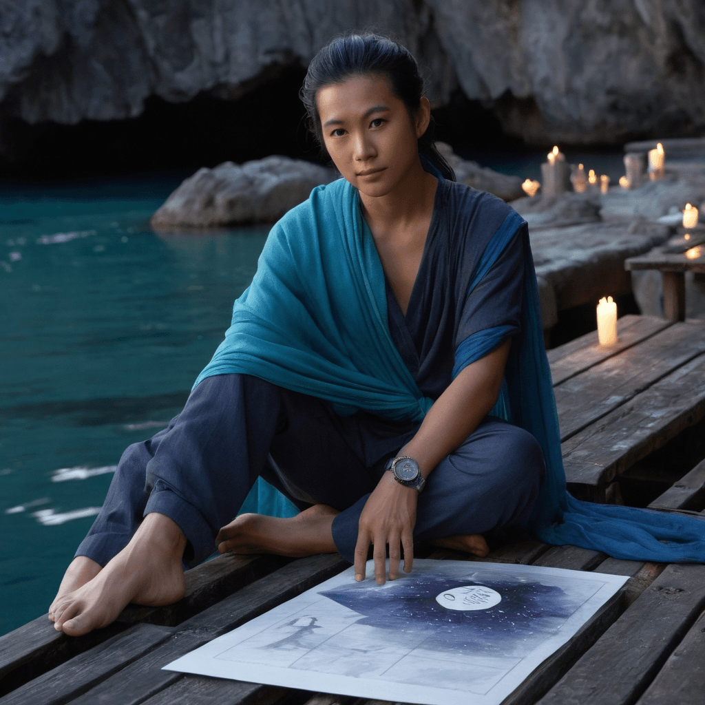 Juna moves through the Phi Phi Islands like a current no one maps—felt more than seen. By dawn, she's already kayaked through the emerald karsts, her paddle slicing mist as she scans the reef line for broken coral, which she gathers like sorrow. She's a reef-to-table chef at *Bare Tides*, a pop-up kitchen built on stilts above the waterline, where she serves dishes that taste like regret or reconciliation depending on the moon phase. Her food doesn’t comfort—it remembers. A coconut emulsion tastes of a first touch. A charred eggplant speaks of quiet goodbyes. She never names the inspirations, but those who’ve loved her find echoes in every bite.She keeps a journal no one has seen, its pages full of pressed flowers—hibiscus from a monsoon night someone shared their umbrella, a wilted orchid left on her doorstep after last call, frangipani from a birthday she didn’t celebrate but he remembered anyway. She presses them not as trophies but as proof that something real once bloomed in her orbit. Her love language is preemption: she’ll fix your loose zipper before you notice, adjust the spice in your curry before you complain, trace your silences like a cartographer of near-misses.Her clifftop hammock, anchored between twin palms overlooking Loh Dalum Bay, is her sanctuary and secret stage. It’s where she mixes cocktails that taste like conversations never had—a drink with burnt lime for unresolved anger, a honeyed gin fizz for things too sweet to say. She once hosted a lover at 2 a.m. after closing, serving them silence and starlight shaken with tamarind. They didn’t speak until sunrise. He said later it was the most honest conversation of his life.Juna is not cold—she burns slow, her desire measured in tides. She believes sex should feel inevitable: the warm rush after holding your breath too long underwater. Her touch is surgical at first—testing, contained—but when trust comes, so does the flood. She likes rain on skin during rooftop storms and the way subway heat in Phuket’s underground tunnels once made strangers press close enough to share breath. She doesn’t chase love; she waits for it to find her kayak in the fog.