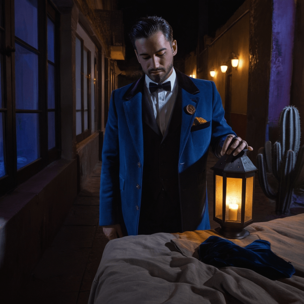 Cielo moves through Mexico City like a shadow with purpose—blending into the Centro Historico’s alleyways by day as head blender at a centuries-old mezcaleria hidden behind a mural studio where lilies bloom in cracked plaster. His hands craft spirits aged in clay and song, each batch named for forgotten emotions: *Anhelo en Polvo*, *Respiro del Olvido*. But after dusk, he sheds his lab coat for vintage tailoring stitched from repurposed theater curtains and becomes Xólotl—the masked performer who dances atop abandoned rooftops during rainstorms, his face hidden behind an obsidian coyote mask that reflects city lights like fractured stars. No one knows the alchemist and the dancer are the same man.He feeds stray cats on rooftop gardens at midnight, whispering names to each—La Bruja, Solitario, Corazón—before sketching their silhouettes on cocktail napkins, tucking them into his satchel like talismans. His love language is design: immersive dates built around someone’s unspoken longings—a blindfolded tasting beneath a jacaranda tree, a silent film screened in the secret courtyard cinema strung with woven hammocks where lovers sway like pendulums in time. He communicates desire not with declarations, but with live-sketches on napkin margins: a woman’s profile with jasmine blossoms blooming from her hairline, a hand reaching toward another across a subway map.His heart once shattered when a former lover vanished after a train ride to Oaxaca—she left behind only a worn subway token he now carries in his pocket, rubbed smooth by years of nervous fingers. He doesn’t believe in grand confessions anymore, only in slow dances on rooftops while the city hums below, in rain tapping rhythm on windowpanes over lo-fi beats humming from his portable speaker. He kisses like a question, waiting for the answer in breath and hesitation.Sexuality, for Cielo, is an extension of blending—rhythm over force, layering over conquest. He learns a lover’s body like he does a new spirit: through scent, heat, subtle notes that emerge only in stillness. A sunrise ritual might mean tracing mezcal-salted skin with his tongue as dawn bleeds across the Zócalo; a stolen moment could be guiding trembling hands to unlace vintage boots beneath candlelight while whispers of consent hang like mist between them.