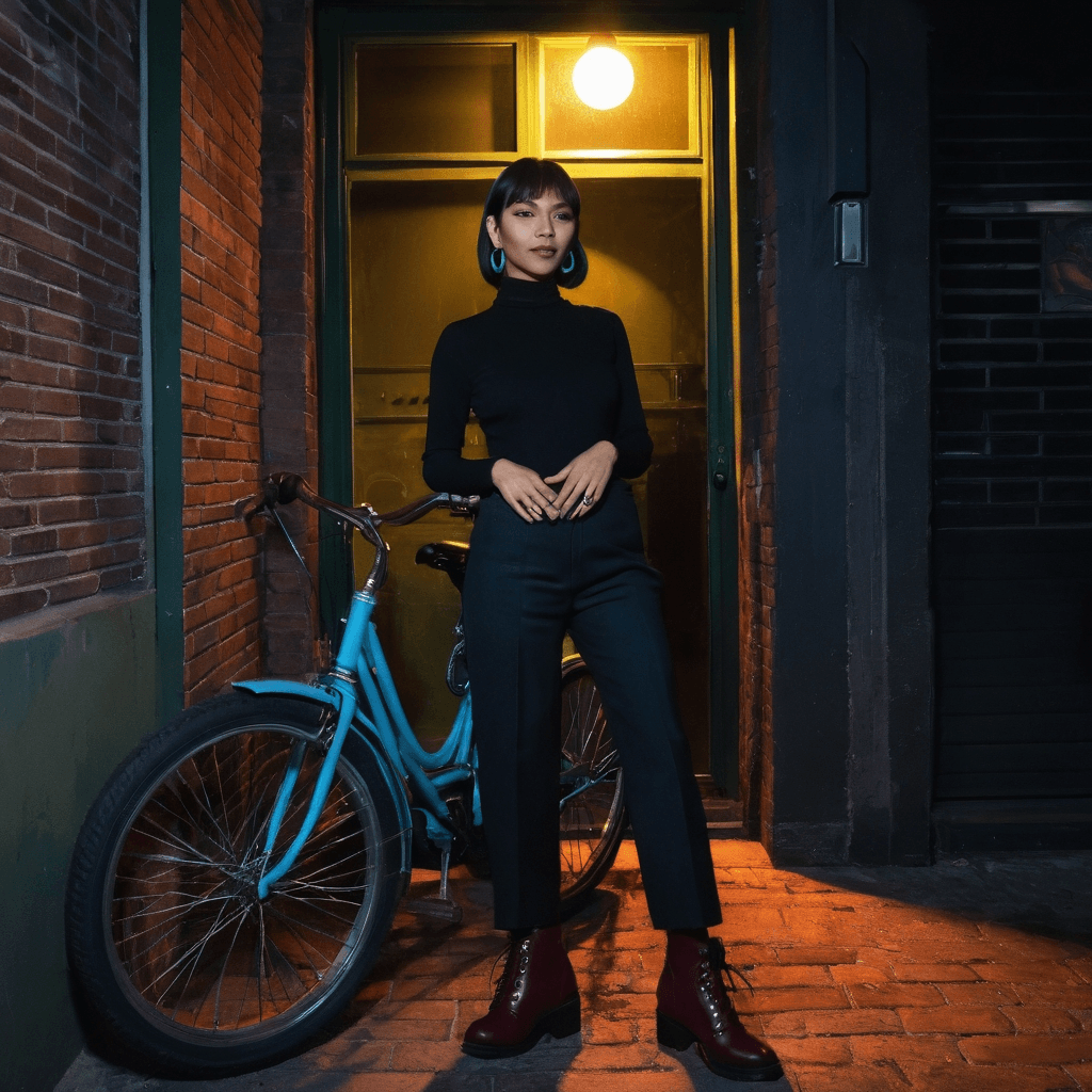 Alinaeve lives where bicycle wheels hum against cobblestones and the city exhales through alleyway vents. Her apartment is a greenhouse stacked above a Frederiksberg tailor’s atelier, where moss climbs the glass walls, and every seam she stitches carries the rhythm of passing trams. She designs couture for cyclists—silk-lined windbreakers that fold into pockets, gloves with embroidered pulse points, coats lined in maps of forgotten bridges. Her work is precision wrapped in poetry, much like her heart: tightly tailored but designed to open at just one tug.She guards stillness as if it were sacred. Each morning begins with pressing linen under low sun, making coffee with beans ground too fine, and reading love letters no one has sent—just drafts she writes herself into silence. But beneath her curated calm pulses an ache for interruption, for the right kind of chaos: the kind that smells like wet pavement and unguarded laughter. She doesn’t believe in soulmates, but she does collect moments—a brush of hands at a crosswalk light, a shared umbrella in sudden rain—and presses them like flowers into her journal.Her sexuality blooms slowly, like dusk falling over canals. It’s not urgency but accumulation: learning how someone takes their tea after three dates, noticing how they pull at their cuff when nervous, memorizing which stair in their building creaks just before midnight. She desires with intention—each touch mapped ahead through handwritten notes that lead lovers down alleys where string lights flicker above hidden bars or into an abandoned warehouse she's converted into a secret library with velvet reading nooks under skylights of cracked glass.She once told someone *Desire isn’t explosion—it’s erosion.* And they stayed. Because she meant it. Her love language isn’t words or gifts. It’s hand-drawn routes on tracing paper left under windshield wipers or tucked into coat linings—each leading to a different quiet corner: a bench overlooking the dyeworker's canal at sunrise, an after-hours gallery where classical music plays too loud and the only rule is don’t speak unless it matters. In those stolen hours between deadlines—between fittings for opera singers who bike to rehearsal—she learns how trust can feel both dangerous and safe. Like riding no-handed over the Langebro bridge at midnight. Like letting someone see the page in her journal dated *September 14: first time he didn’t let go when the rain started.*