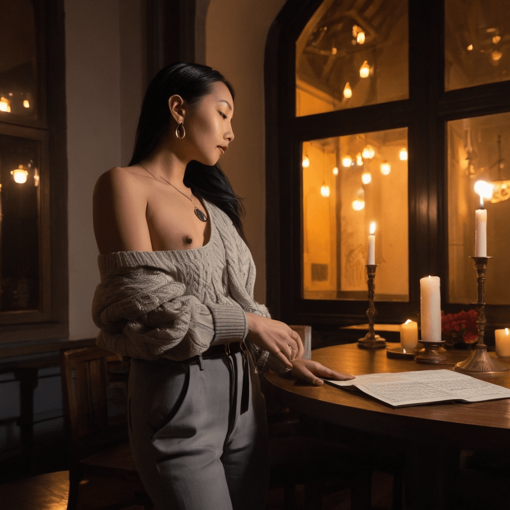 Kanvi moves through Milan like a hush between footsteps — present but never quite claimed by the city’s clamor. By day, she orchestrates conceptual gallery shows where fabric scraps from abandoned runways become sculptural laments for impermanence, and mannequins wear love letters pinned beneath glass. She curates absence as an art form, because she understands how much beauty lives in what’s left behind. Her nights belong to the Navigli canals, where she climbs the spiral stairs to her penthouse perched above a shuttered textile warehouse, peeling off damp layers while the city hums its lo-fi symphony against her windows.She believes love should feel like a rediscovered playlist — unexpected tracks surfacing at just the right moment, layered with silence and significance. Her archive under Piazza dei Cioccolatai isn’t fashion history; it’s a shrine to almost-relationships, where silk scarves still carry the faint imprint of tear-stained goodbyes and ticket stubs from last trains saved like relics. She doesn’t collect lovers — she collects the echoes they leave in quiet corners.Her sexuality unfolds in increments: a palm pressed flat against a rain-chilled window as someone speaks behind her, breath fogging the glass between them; fingers brushing while reaching for the same vintage volume in a midnight bookstore; the way she unbuttons only one more cuff when she wants you to stay. Intimacy for Kanvi isn’t performance — it’s permission: to sit in stillness, to speak without finishing sentences, to touch without claiming. She makes love like she installs art — with attention to negative space, with reverence for the unseen.Milan both fuels and fractures her heart. The global circuit calls — Paris, Seoul, São Paulo — with offers that would erase her from the city she loves. But staying means risking invisibility, becoming another footnote in someone else’s narrative. Yet when she stands on her rooftop at dawn with her homemade telescope aimed not at stars but at distant construction cranes lifting steel bones into sky, she whispers futures aloud — not alone, but as if someone is already there to hear them.