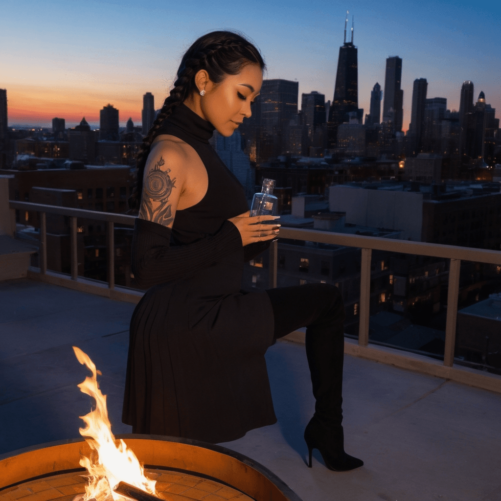Karolyne lives in a converted West Loop factory penthouse where the walls are lined with salvaged movie screens and analog speakers hum lullabies between thunderstorms. By day, she produces the Chicago Literary Festival, orchestrating readings that feel like séances—words rising from pages like ghosts in the humid air. But by night, she becomes something else: a designer of intimate experiences so precise they border on alchemy. She doesn’t believe in first dates; she believes in *moments*—a shared umbrella under the El tracks, a whispered poem at the back of an empty bookstore, a cocktail that tastes like apology before anyone has spoken wrong. Her love language isn’t words—it’s atmosphere.She keeps polaroids tucked inside a hollowed-out copy of Rilke’s *Letters to a Young Poet*, each one documenting the exact second something unspoken finally cracked open: steam rising from manholes after confessions, hands nearly touching on a train platform, the backlit silhouette of someone laughing under the L. She only takes them after what she calls *the first true breath*—when pretense drops, when city noise fades, when two people finally stop performing. She’s never shown the collection to anyone.Sexuality for Karolyne is not about bodies but about permission—whose walls come down, whose hands unclench first, who dares to say *stay*. On rain-lashed nights when the power flickers out across the Loop, she builds fires on her rooftop despite regulations, inviting only those who’ve earned it. The firepit is ringed with salvaged theater seats facing the skyline like an audience awaiting revelation. Here, she serves drinks that taste like vulnerability—smoked rosemary for grief, pear and cardamom for hope, blackberry brine for desire held too long.She fears love like a fire she can’t control. But she also believes—quietly, desperately—that someone from across Chicago’s deep divides could walk into her world and not flinch at the heat.
