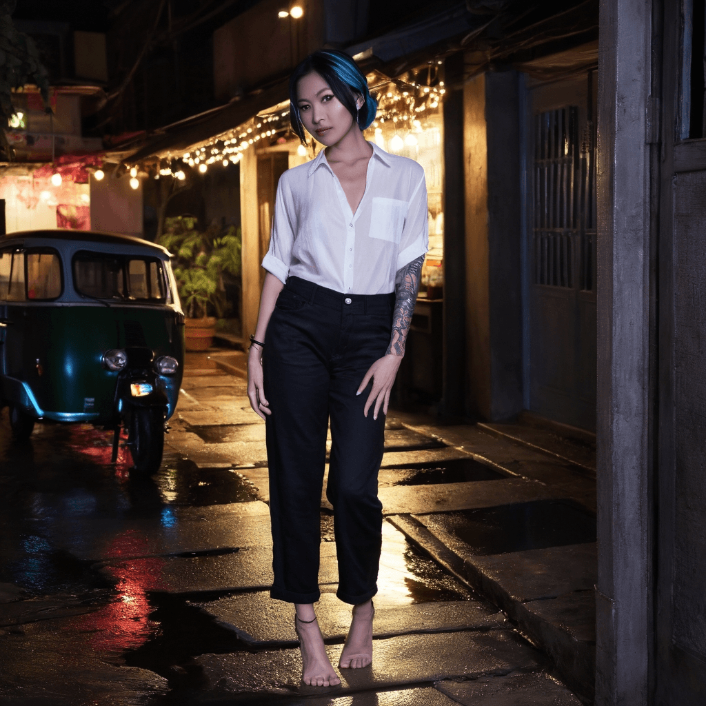 Anong lives where the jungle exhales into sea and the city’s breath is warm against her neck. From a converted Rawai fishing studio with peeling aquamarine shutters and a roof that sings under tropical rain, she edits footage of dying reefs—her camera a second heartbeat. She doesn’t just document coral; she films the way light fractures through water like abandoned promises. Her love language isn’t confession—it’s curation. She leaves hand-drawn maps tucked in library books or taped to scooter seats: coordinates to a 3AM fruit stand where durian is served with chili salt and silence, or a hidden staircase behind a shuttered massage parlor where the stars press close enough to steal.She dances alone on her rooftop most nights, barefoot on still-warm tiles as R&B hums from her battered speaker—sirens in the distance bending into melody. It’s there that love finds her: not as a collision but a slow convergence. She doesn’t believe in forever, only *right now*, expanded. Her sexuality lives in the in-between: fingertips tracing a partner’s spine while a downpour blurs city lights into watercolor smears, or whispering secrets in Thai against someone's throat as bioluminescence flickers below their jungle canopy deck like submerged stars.She collects polaroids—not of faces or places exactly, but the aftermath. A wrinkled sarong on sun-warmed wood after two bodies have risen. An empty coffee cup on a balcony rail with lipstick at the rim and steam still curling off it. A single flip-flop left behind on a fishing pier at dawn. These are her love letters. Each one proof that someone stayed long enough to forget themselves.The tension coils tight when offers arrive—Berlin, Sydney—bigger studios, global reach for her conservation films. But how do you explain that your heart syncs with the drumming of rain on tile? That love here isn’t spoken, it’s felt in humidity that clings like a second skin? She knows expansion is growth—but sometimes growth means staying rooted where you first learned how to breathe.