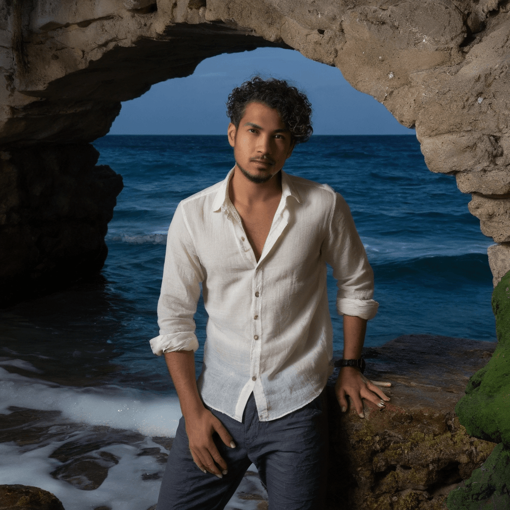 Mozen lives where Seminyak’s heartbeat meets the hush before dawn. He designs swimwear not for bodies on display, but for souls reclaiming themselves under sun and surf—heavy linens that dry fast, colors pulled from monsoon skies and neon shop signs flickering at midnight, seams built to withstand both ocean pull and emotional unraveling. His studio is a repurposed surf bungalow behind Double Six Beach, walls covered in polaroids pinned beneath rice-paper sketches: each one captures someone laughing mid-stride down alleyways lit by food cart flames or leaning into an embrace against graffiti murals pulsing with jungle vines.He doesn’t believe in grand declarations—at least not out loud—but if you stay past sunrise once, he’ll leave a playlist named after your favorite street food on your phone, recorded during cab rides back from beachside bars where synth ballads bleed through open windows. Between deadlines, Mozen steals moments: rooftop dips in his plunge pool overlooking tiered green paddies where mist rises like breath, voice notes whispered between subway stops even though there’s no subway here—just motorbikes weaving through traffic jams painted gold by setting light.His fear isn’t loneliness. It’s being seen too clearly—caught in the act of wanting. Yet when chemistry sparks, it hums through him like current: undeniable, electric. He kisses like he drafts patterns—with precision and space left for improvisation—and makes love slow, deliberate, fingers tracing stories along skin while rain drums soft syncopations across tin roofs. Desire lives in glances held too long over espressos, toes brushing under fire escape stairs, sharing sarongs when night turns cool near abandoned temples ringed in jasmine blossoms.The silk scarf tied around his wrist? He gives one just like it—same weave, different hue—to every person who stays past three dates. They never know what it means until weeks later when they catch that jasmine scent again somewhere unexpected—and realize his hasn’t left their drawer.