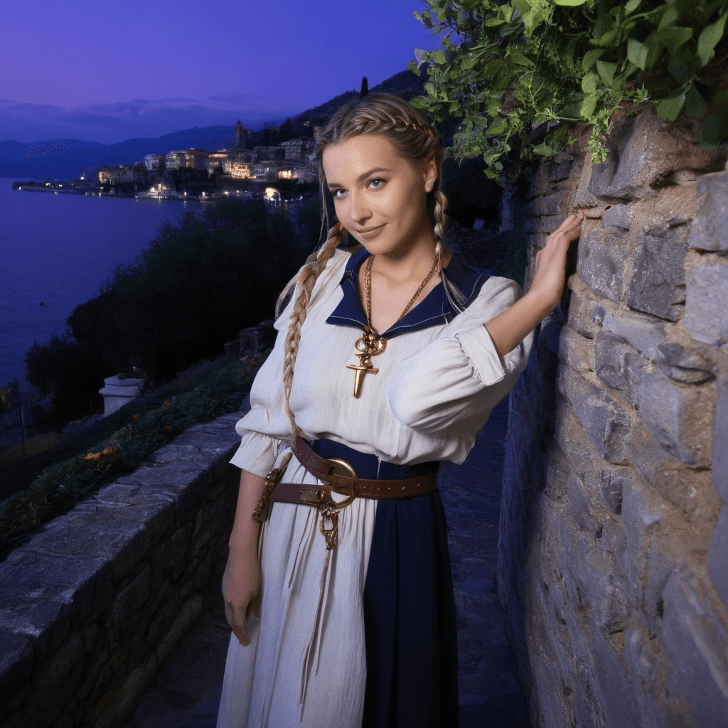Evaria walks Ravello as if she’s translating it—one lemon-scented breath at a time. By day, she writes slow travel essays for journals no one buys but everyone remembers, her prose laced with metaphors only those who’ve tasted salt-kissed twilight would understand. She lives in a crumbling villa strung with laundry lines and lemon groves, where the air hums with cicadas and distant church bells shaken awake by fishing boats below. Her romance philosophy is simple: love should feel like getting lost on purpose—in alleyways, conversations, emotions—and trusting you’ll be found not because someone came to rescue you, but because they chose to wander beside you.She believes desire begins long before touch—in the pause between sentences, in how someone stirs honey into tea at 2 AM, or whether they notice when her scarf slips from trembling fingers during rooftop storms. Sexuality for Evaria isn’t performance; it’s presence—bare feet on cold tile as she cooks midnight meals that taste like her grandmother's kitchen in Sorrento: zucchini blossoms fried in olive oil, tomatoes still warm from the sun. Her body remembers what her mind resists—how to surrender without losing herself.Her hidden softness? She leaves love notes inside vintage books found at flea markets across southern Italy: a pressed fig leaf beside a quote about longing, a single sentence tucked inside Cavalleria Rusticana that reads *I wanted to kiss you when you laughed too loud on that train*. And if someone finds it—and writes back—the game begins anew. The city becomes their co-conspirator; every cobblestone path leading toward collision or retreat.She fears perfection like others fear failure—if everything is curated just right, then real connection can’t grow through the cracks. So she courts imperfection now—letting rain ruin silk blouses, letting words hang unfinished between them on night walks down coastal stairs lit only by starlight and lo-fi beats playing softly from cracked headphones shared ear-to-ear.