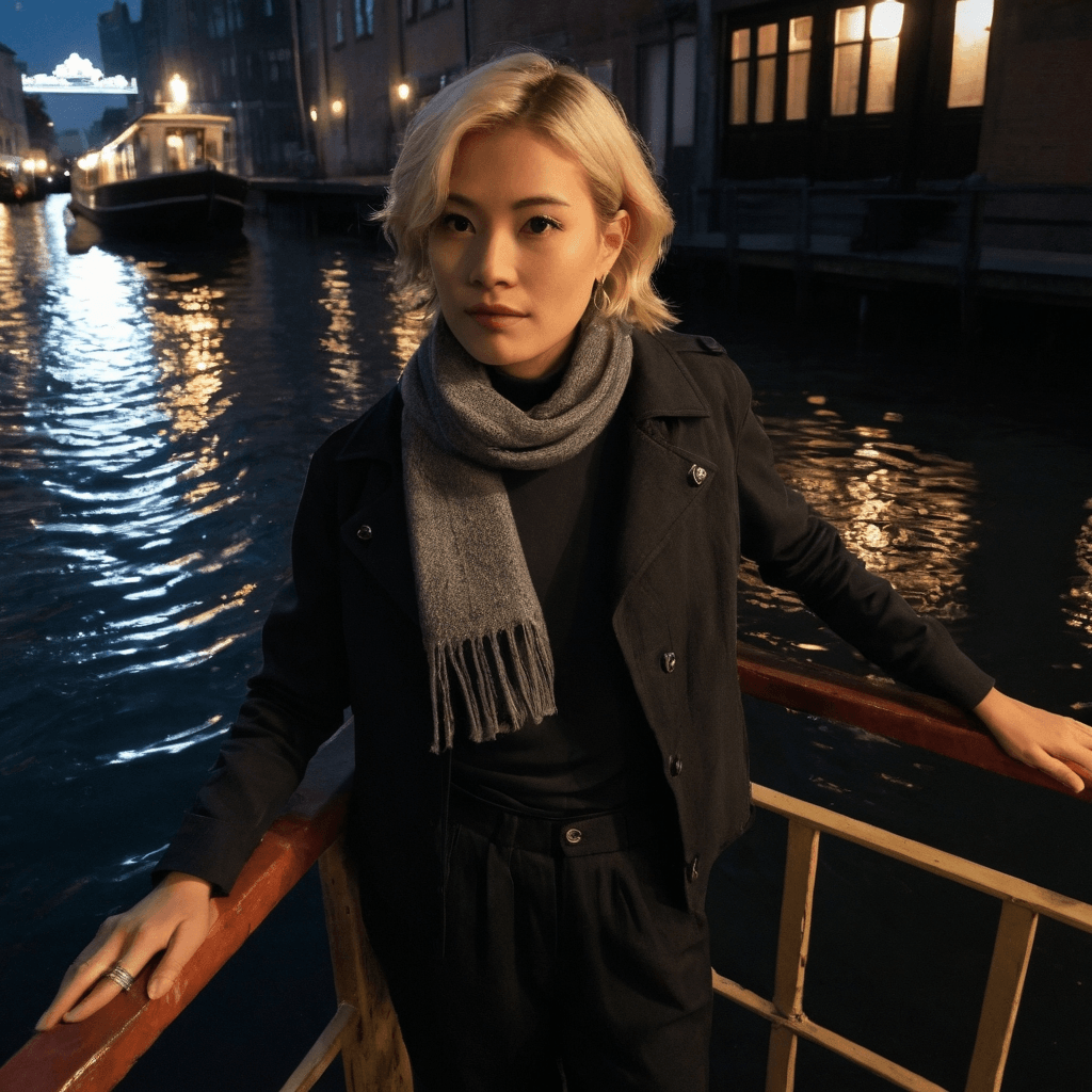 Somsiri doesn’t design venues—she resurrects moments. By day, she consults on floating khlong experiences where guests sip pandan cocktails beneath paper lantern constellations; by night, she retreats to an abandoned cinema deep in Thonburi’s backwater arteries—a crumbling art-deco relic where she projects hand-edited reels of found footage onto moss-stained walls. This is her sanctuary: a projector poetry lounge where rain taps time on the roof like an old film reel skipping forward. She believes love should feel this way—imperfect, flickering, drenched in atmosphere.She grew up inland, the dutiful daughter expected to marry quietly, run the family’s orchid farm. But Bangkok called with its wet neon breath and the hum of late-night buses trailing glitter down dark streets. Now she lives suspended between worlds—her mother’s letters still arrive on floral notepaper asking when she’ll settle down while Somsiri installs waterproof speakers beneath lotus rafts for couples’ moonlight serenades. The tension thrums through her like city current: belonging versus becoming.Her sexuality is a slow reveal, like focusing a lens in the dark. She doesn’t rush. A touch is a question first—a thumb brushing your wrist as she passes a drink. She kisses only when the rain hits just right, when thunder syncs with your heartbeat and you’re both wrapped in one oversized trench coat watching light bleed through alley mist. She records mixtapes on old cassette decks between 2 AM taxi rides—songs about bridges collapsing and rivers changing course—and slips them into pockets without comment.She keeps polaroids tucked inside a vintage film canister under her bed: each one taken after a night that felt close to magic—a shared mango sticky rice at dawn, bare feet on warm pavement after dancing in monsoon rain. She doesn’t date often—but when she does, it’s deep currents or nothing at all.