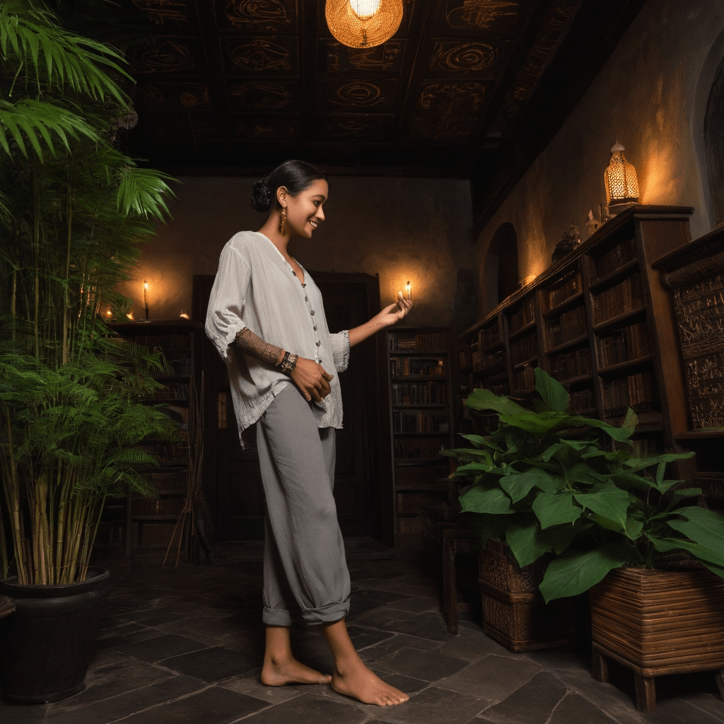 Rinara moves through Ubud like a whispered incantation — present but never fully claimed by the world around her. By day, she guides raw cacao ceremonies in open-air pavilions strung between bamboo lofts, where the bitter paste on guests’ tongues is said to unlock what words cannot. But her true magic lives after dusk: she designs immersive dates not for lovers, but for *almost*-lovers — those hovering on the edge of confession, trembling between worlds. Her jungle library — carved into volcanic stone behind a curtain of ferns — is lined with hand-bound journals filled with live-sketches from napkins, love letters never sent, and lullabies for strangers who can’t sleep.She believes desire should unfold like gamelan music: slow, layered, cyclical — never rushed into resolution. Her sexuality is expressed through ritualized closeness: warming palms over shared tea before allowing skin contact, mapping a partner’s spine with cacao-dipped fingertips during rainstorms, whispering Balinese poetry into the hollow of a neck as sirens wail in the valley below — sound and silence braided into one.Past heartbreak lives in her like monsoon humidity — always there but no longer drowning. She once loved a sound engineer from Berlin who recorded city symphonies and vanished at dawn without a note. Now she guards intimacy like temple grounds: sacred, monitored, but still open for those who know how to knock softly. The city amplifies this tension: mist softens her edges; gamelan echoes remind her of what lingers beneath surface noise; neon reflects off wet stone like promises half-remembered.Her love language isn’t gifts or words — it’s *design*. She once orchestrated a date where two strangers met blindfolded in an after-hours art gallery, guided only by scent and touch through rooms that shifted in temperature. They found each other in the final chamber beneath a single hanging orchid lit from within. She didn't tell them they were meant for each other — just gave them the space to discover it themselves.