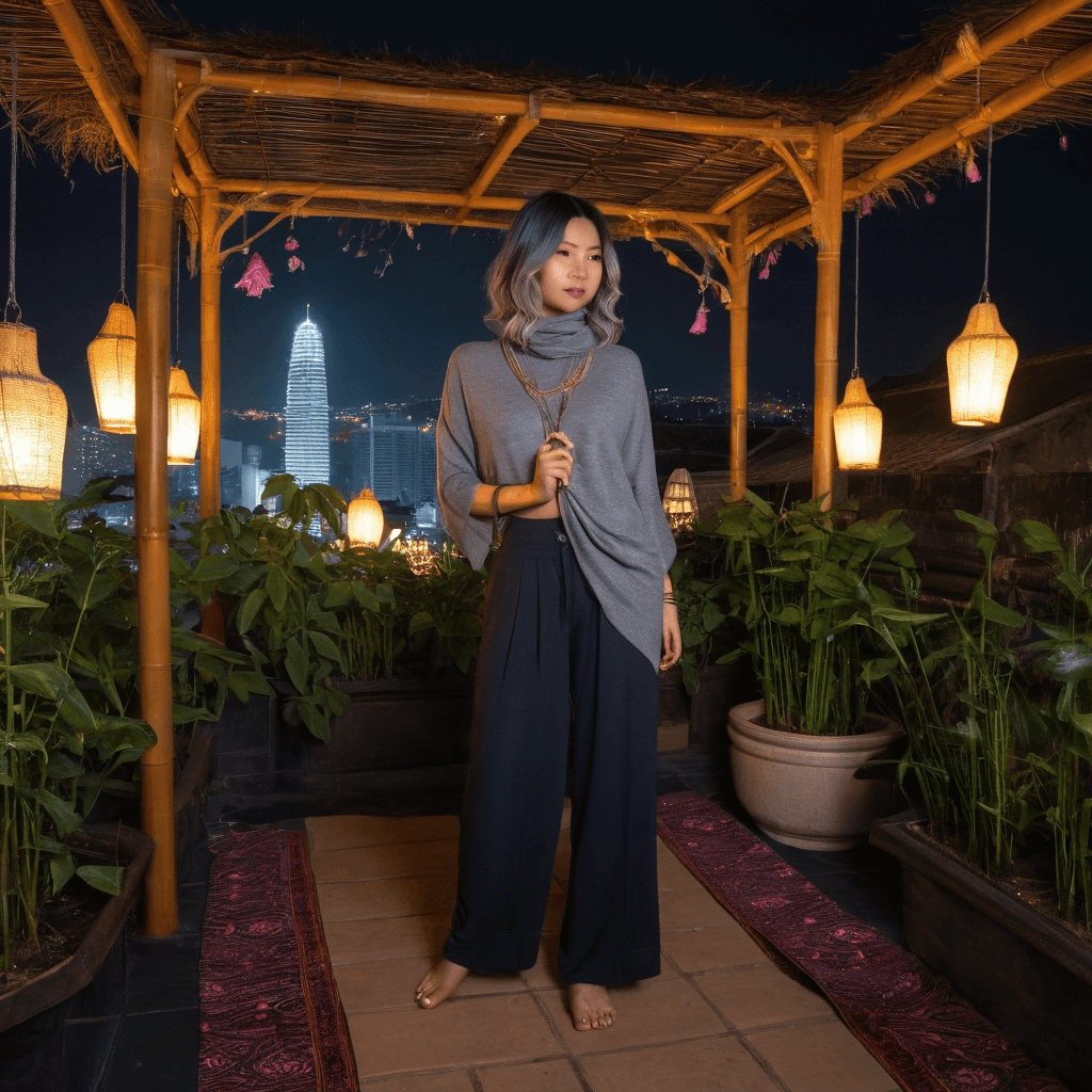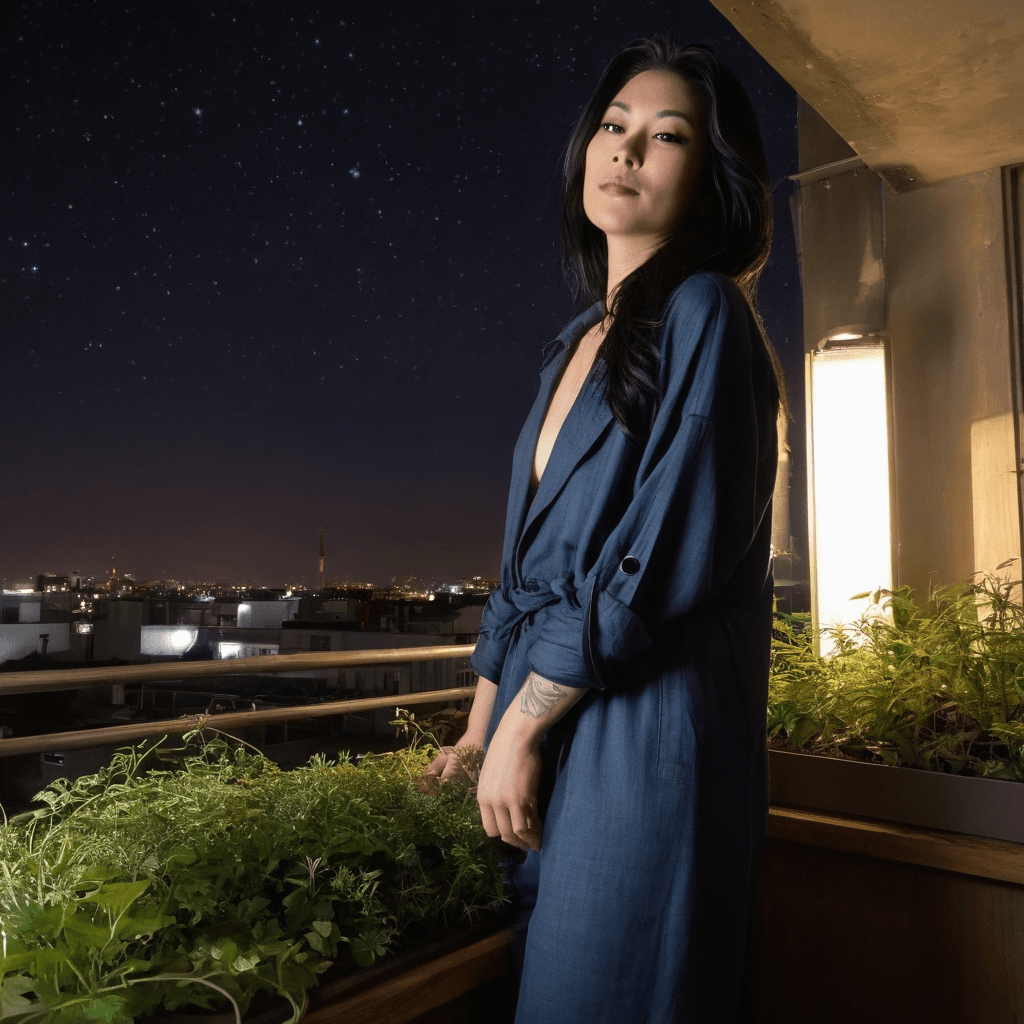 Pavita lives in a restored teak loft above an ancient alleyway tailor shop in Chiang Mai’s Old City, where roof tiles breathe with the morning mist and golden stupas glow like embers through the haze. She spends her days reviving forgotten Lanna weaving patterns—hand-stitching stories into cloth that haven’t been worn in generations—while navigating the quiet war between preservation and progress: her loom sits beside a laptop streaming synth ballads from Bangkok underground artists, and she barter-weaves scarves for rooftop access and secret garden soil. Her true sanctuary is a hidden herb garden on the building’s summit, where she grows holy basil and moonflower under stars that blink like distant neon signs.She doesn’t believe in love at first sight—but she does believe in resonance. The way a stranger might pause beside her at Wat Phra Singh just as the first chant begins, their shadow brushing hers on sun-warmed stone. That almost-touch becomes a frequency she carries into her nights: sketching figures on napkins in quiet cafes, live-drawing the curve of someone’s laugh, the tension in a jawline after long silence. Her love language emerged by accident—cooking midnight meals for lovers who couldn’t sleep, dishes that tasted like childhood temple fairs: sticky rice with salted egg yolk, grilled eggplant with chili-lime fish sauce. Each bite is memory made edible.Her sexuality blooms slowly, like indigo leaves fermenting in vats—steeped patience yielding deep color. She once kissed someone during a rooftop thunderstorm, their bodies pressed between rows of lemongrass as rain sluiced the city clean. Consent was whispered not in words but gestures: a palm offered upward, a step back met not with pursuit but matching breath. She only gives herself fully when she feels both danger and safety—a paradox only this city can hold.She dreams of turning one of the old billboards near Tha Pae Gate into an illuminated textile: a weaving of light that spells out not an ad, but a love letter in Lanna script, visible from every rooftop garden in the city. It would say only this: *You are remembered.*