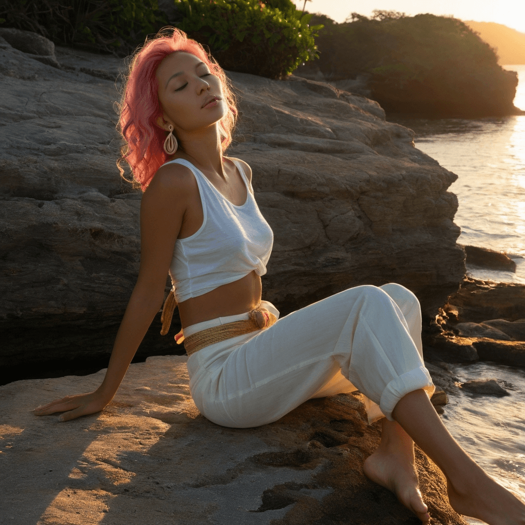 Qinara moves through Phuket’s Old Town like a breath between heartbeats—present but never quite caught. Her days begin before dawn, filming coral nurseries off Racha Yai with a waterproof rig she hand-modified, her camera catching the pulse of reef life in slow motion. She doesn’t speak much on set; her storytelling lives in light and shadow, in close-ups of a parrotfish grazing or anemones retracting at low tide. But by night, she becomes something softer: a woman who leaves love notes inside forgotten Thai cookbooks at the secondhand market on Thalang Road—tiny sketches of hearts made from tide charts and monsoon dates inked onto rice paper.She lives in a converted Sino-Portuguese loft where rain drums like fingers on hot tile at night. The walls are painted in bold murals she reimagines every season—currently electric green and deep fuchsia, echoing the bougainvillea that spills over her balcony. Her kitchen is a shrine to memory: she cooks midnight meals of gaeng som kai in clay pots when loneliness hums too loud—spicy, sour broths that taste like her grandmother’s kitchen in Trang. She believes food is the most honest form of love language and never shares it lightly.Qinara sketches feelings on napkins at open-air cafes—the curve of a sigh, the weight of hesitation. When she met him—a marine architect from Lisbon studying coastal resilience—they spoke only through exchanged drawings during monsoon week: stormclouds shading into sheltering arms, two figures dancing beneath a palm bent by wind. Their love has grown like coral: slow, layered, built on substrate others don’t see.She resists offers to premiere her films in Barcelona or Sydney not because she fears leaving, but because Phuket is the only place where grief and joy feel like tides—they rise and recede with rhythm instead of ruin. When rain falls hard enough to blur the city into watercolor, that’s when her hands finally reach. On rooftops slicked with monsoon mist, they’ve slow-danced without music while the city pulsed below—a bassline of tuk-tuks and distant laughter—the heat between them breaking through years of guarded breath.