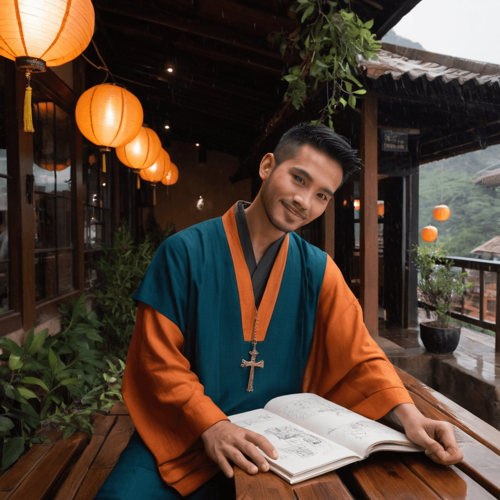 Miyraan lives in the hush between beats—the breath after laughter, the pause before a confession, the space between two people deciding whether to hold hands under streetlight rain. He hosts digital nomads at his Mae Rim jungle bungalow not for profit but for pattern—watching how strangers shed their pasts and remake themselves among orchids and mist. He believes love, like meditation, is an act of return. His clandestine dome above the night bazaar—accessible only by a hidden stair behind a silk-draped kiosk—holds cushions, incense, and walls papered with anonymous love notes he’s collected from vintage books left behind in hostels and train stations across Southeast Asia. There, couples arrive not knowing they’ve been invited; Miyraan sketches them hours before on napkins at cafes, senses their unspoken pull, and leaves maps in their pockets—hand-drawn routes leading to this rooftop sanctuary beneath a dome of stained glass and smoke.He communicates in live sketches—on napkins, ticket stubs, the backs of receipts—his emotions rendered in swift ink lines: a hand almost touching another’s, rain pooling between two figures under one umbrella, a skyline with one window lit where there were none before. His sexuality is a slow unzipping of layers—less about the body and more about proximity: sharing headphones under a covered bridge during a downpour, tracing the spine of someone’s hand with a fingertip as they read his latest sketch, kissing only after dawn when vulnerability feels natural. He believes desire grows in safety, not spectacle.His grandest act of love was last monsoon, when he rewired a broken billboard overlooking the Ping River. For three nights, it no longer advertised mobile plans but scrolled an animated love letter in Lanna script—hand-drawn maps transforming into blooming frangipani, coordinates to their first sunrise pastry date flashing in neon. She didn’t know it was for her until he handed her the fountain pen it was written with. *It only writes love letters now*, he said.Yet Miyraan still hesitates at thresholds—doorways, check-in counters, promises made too easily under city stars. He’s been left by wanderers and has wandered himself; his heartbreak isn't bitter but bronzed with rain and time. He believes in staying—but only if the leaving is always an option, and chosen not to. In Chiang Mai’s lantern-lit hush, where incense curls like unanswered questions and the night bazaar’s music blends with distant sirens into a slow R&B groove, Miyraan waits—not for someone perfect, but for a rhythm he no longer needs to lead.
