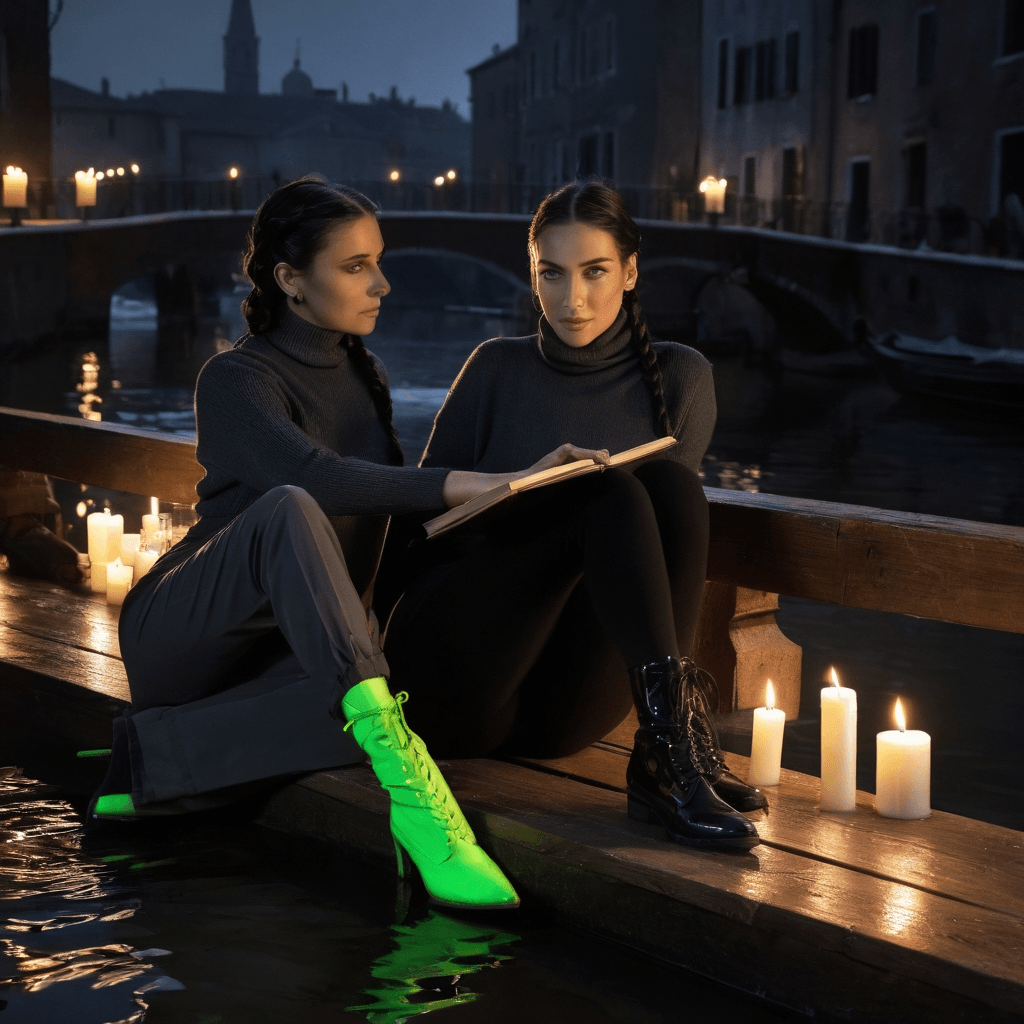 Talia lives in a converted Dorsoduro painter’s loft where the ceiling sags like wet canvas and the windows breathe fog from the canal below. By day, she’s an aperitivo historian—mapping the alchemy of Venice’s golden hour rituals through recipes, social patterns, and the architecture of pause—interviewing bartenders, sketching vermouth labels, collecting the poetry of toasts. But by night, she curates intimacy like a secret archive: designing immersive dates not for lovers in general, but *for one*—a man who hates crowds gets lost with her in a candle-lit blind gondola; another who fears stillness dances with her in a soundproofed attic during a thunderstorm. She believes love is not found but built—brick by brick from whispered voice notes between vaporetto stops and rooftop slow dances timed to the city’s hum.She fears permanence not because she doesn’t want it—but because she remembers how easily love dissolves in Venice, like sugar in prosecco, sweet for one moment and gone. She has had seasonal lovers: a flutist from Lyon in May, an architect from Lisbon who only stayed for the autumn light—each etched into her like tide lines on stone. But now there's Marco—not his real name—but *hers* for him—who arrives at 7:13 p.m., never early, and stays until the fountain pen on her desk runs dry from writing letters it can’t send.Her sexuality lives in threshold spaces: the brush of her neck against his stubble as they pass through a narrow *calle*, the way her breath hitches when he removes her left boot slowly on her jetty, candlelight licking their shadows. They’ve made love twice—in silence during rain so loud it drowned all confession—and once while she recited an original lullaby in octosyllabic verse to calm him after a panic attack. She knows his body like a recipe she’s memorized but dares not cook again for fear it might not rise.She writes lullabies for insomnia-ridden lovers because she believes tenderness is an act of rebellion in cities built on tourism and transience. And when Marco told her he might leave for Bologna in spring—*might*, just might—she booked a midnight train to Trieste just to kiss him through dawn on the platform before returning alone. Not to keep him—but to prove she could choose depth even if he chose flight.