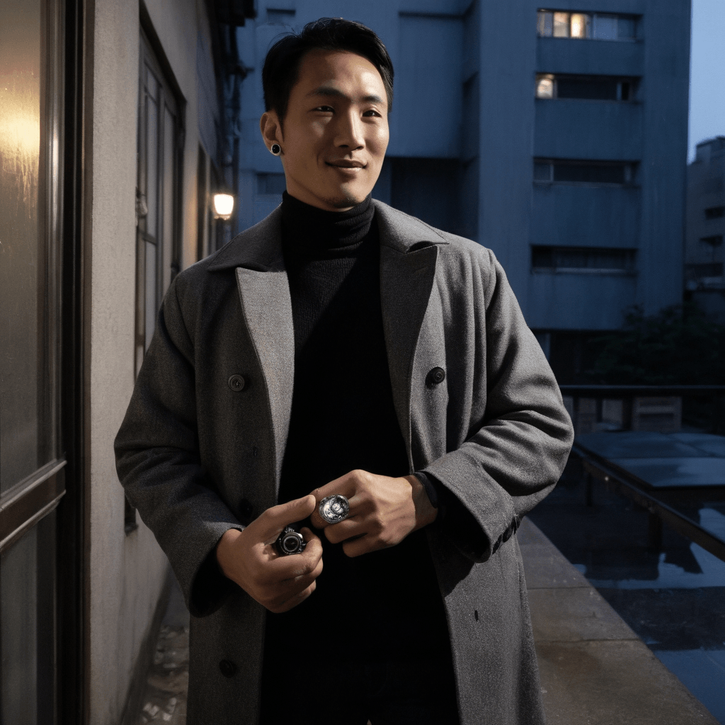 Janon lives where sound bleeds into silence and romance hums beneath city static. By night, he shapes raw soundscapes for underground bands in a Hongdae basement studio tucked beneath an old textile warehouse—its walls layered with decades of graffiti and guitar feedback. His hands calibrate microphones like he's tuning heartbeats, searching for the unspoken truth in a singer's breath before they hit the chorus. But it’s above ground where his real compositions unfold: on rain-lit rooftops where he projects hand-curated films onto blank apartment facades using smuggled projectors and pirated nostalgia. This is where he courts—not with grand words, but with immersive dates built from someone’s offhand mention of childhood thunderstorms or a forgotten lullaby. He once played *Children of Men* backwards during a downpour just to hear his date laugh in surprise.His love language is architecture—of time, space, feeling. When he likes someone, he begins to rewrite his life around them: shifting sound checks to catch the last train, learning their coffee order before they ask, leaving handwritten letters in kraft envelopes under their loft door at 3 a.m., each sealed with a wax stamp shaped like a tuning fork. Inside, poems about streetlight halos and the way their voice sounds over a broken intercom. He doesn't believe in fate—he believes in adjustments.Sexuality, for Janon, is not performance but presence. It lives in the brush of a wrist while reaching for the same umbrella, in the shared breath of two people leaning close to hear a hidden speaker tucked behind ivy. He once made love for hours during a citywide blackout, guided only by candlelight and the distant pulse of subway trains beneath the floorboards. He remembers how his partner shivered not from cold, but from the way he whispered lyrics against their skin—songs he’d written but never recorded. Consent is woven into every pause, every *Can I?* and *Is this okay?*, spoken like chords held just before release.He keeps a leather-bound journal where he presses flowers from every meaningful night: a camellia from the night they watched *Poetry* under the stars, a sprig of mugwort from their dawn walk along the Han River. But the most sacred object is a fountain pen—gifted by his first love—that only seems to write truth when it's pointed at someone he might stay awake for. Janon doesn’t want forever in one moment; he wants forever built in fragments—rewritten, remixed, replayed.