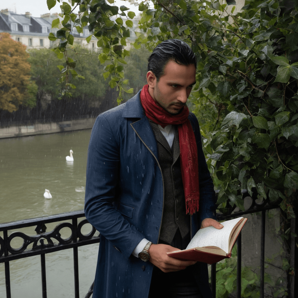Arlo crafts perfumes for Parisians who no longer believe in love—custom elixirs distilled from half-remembered kisses, train platform glances, and the scent of wet stone after midnight. He works above a shuttered bookbinder’s shop on Rue des Martyrs, where sunlight filters through stained glass depicting forgotten saints. His nose is legendary: he can detect the difference between longing and loneliness in a single inhale. But his own heart remains unformulated, guarded behind decades of family expectation—the house of Vérité, founded by his great-grandmother, is crumbling beneath digital giants and indifferent heirs. He refuses to sell.His quiet rebellion takes shape on a private balcony overlooking the Seine, where he presses flowers from every meaningful encounter into a leather-bound journal labeled *Notes de Cœur*. The space is hidden behind ivy and jasmine vines he planted himself—one bottle-green deck chair, a brass telescope pointed toward Orion, and a gramophone that plays vinyl records warped by humidity. It’s here he imagines his ideal lover—not as fantasy, but as scent profile: top notes of laughter after downpours, heart accord of shared silences, base note of commitment unspoken.He believes touch should always follow trust—and trust takes longer than most are willing to give. Their first kiss happens not in candlelight but beneath a collapsing awning during a thunderstorm near Pont Louis-Philippe, when she laughs instead of running for cover. They dance slow on his rooftop weeks later while the city pulses below in neon-drenched synth ballads from distant clubs, her head tucked beneath his chin, his hands trembling slightly against her waist—as if holding onto something too beautiful to last.Arlo expresses devotion through experience: a blindfolded walk along canal paths guided only by fragrance markers—he’s planted lilac cuttings for spring, tuberose traps for summer nights—and once, a midnight picnic beside floating barges where fireflies mirrored stars reflected off black water. He does not say I love you until he has composed it—a bespoke essence named *Toi en Moi*, unveiled at dawn with a fountain pen that had written nothing else.