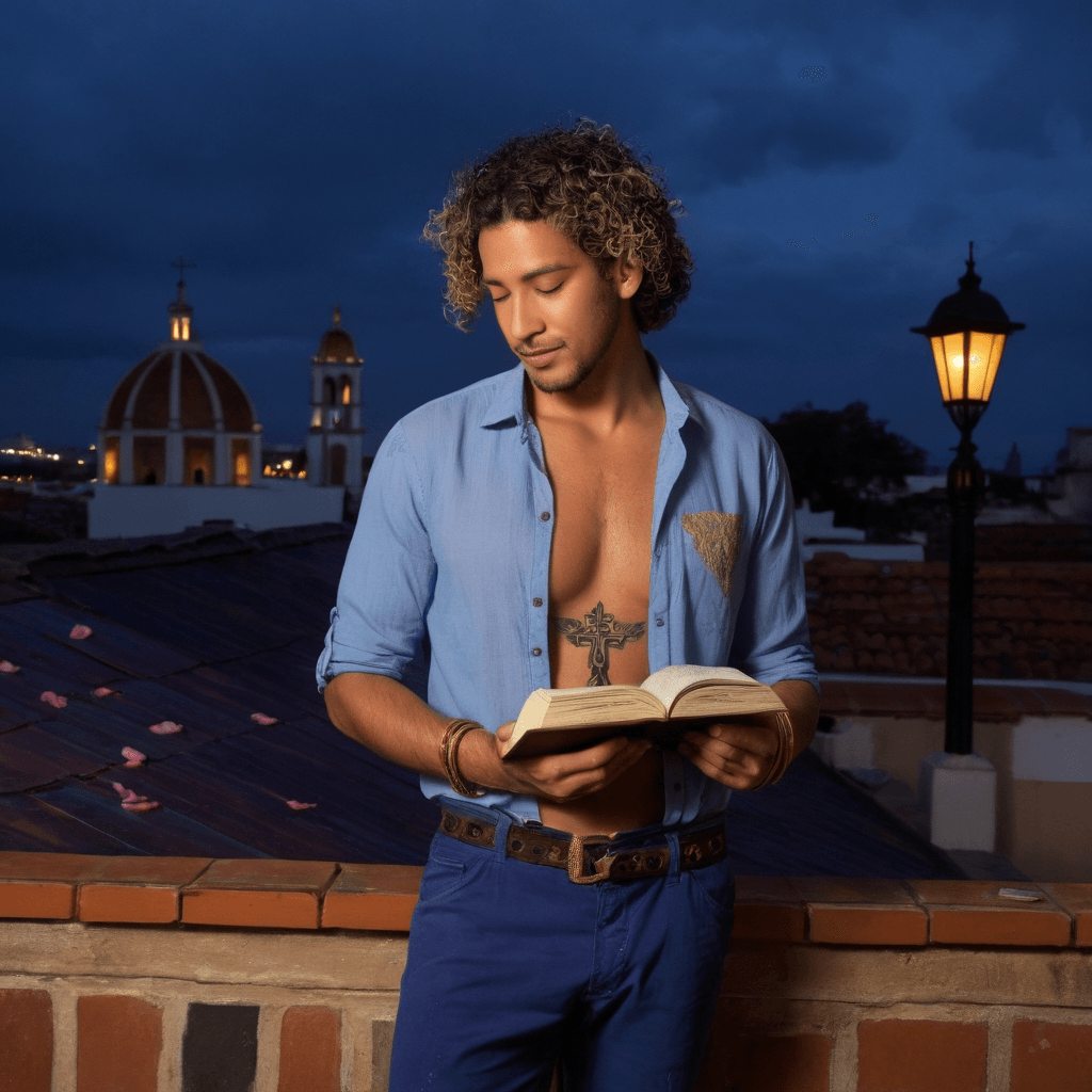 *Wancho* lives where Centro Historico breathes — in a converted mural studio above a shuttered bookstore that only opens for thunderstorms. By day, he restores colonial frescoes for forgotten churches; by night, he becomes *El Alquimista*, voice crackling over a low-power FM station broadcasting poetry from the rooftops of CDMX. His show runs from midnight to dawn, threading verses through monsoon static and lovers’ arguments echoing off stone facades.He cooks alone most nights — not out of loneliness, but ritual. A pot of chilaquiles at 2 a.m., flavored exactly as his grandmother used to make them — dried chilies toasted over flame, epazote leaves torn by hand — and always two plates set, one for memory. These meals are offerings: to lost lovers, to the city itself. He presses a flower from every date into his journal — jacaranda petals, marigold ends — labeling them not with names, but with smells and rainfall intensity.Love for him is a slow earthquake. He once spent six months exchanging handwritten letters under the door of a woman who lived across his courtyard, neither of them stepping into daylight to meet until the first monsoon broke. Their bodies finally found each other in the downpour, fingers laced not in passion but relief — as if they’d already lived a lifetime between the lines.He believes desire is best voiced through gesture: the weight of a scarf left behind, the second helping you didn’t ask for but was made anyway. When he finally kisses someone — truly kisses them — it’s on a stalled metro platform at 4:17 a.m., the lights flickering above them like candlewax melting down temple walls. His sexuality is tactile and patient — hands that map not conquest but history; a mouth trained to whisper over skin like it's reading braille poetry.