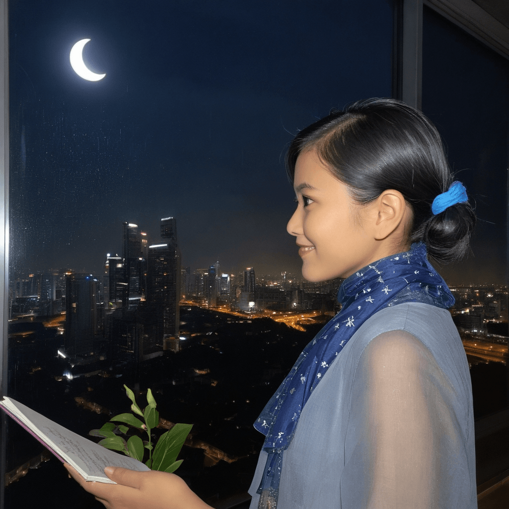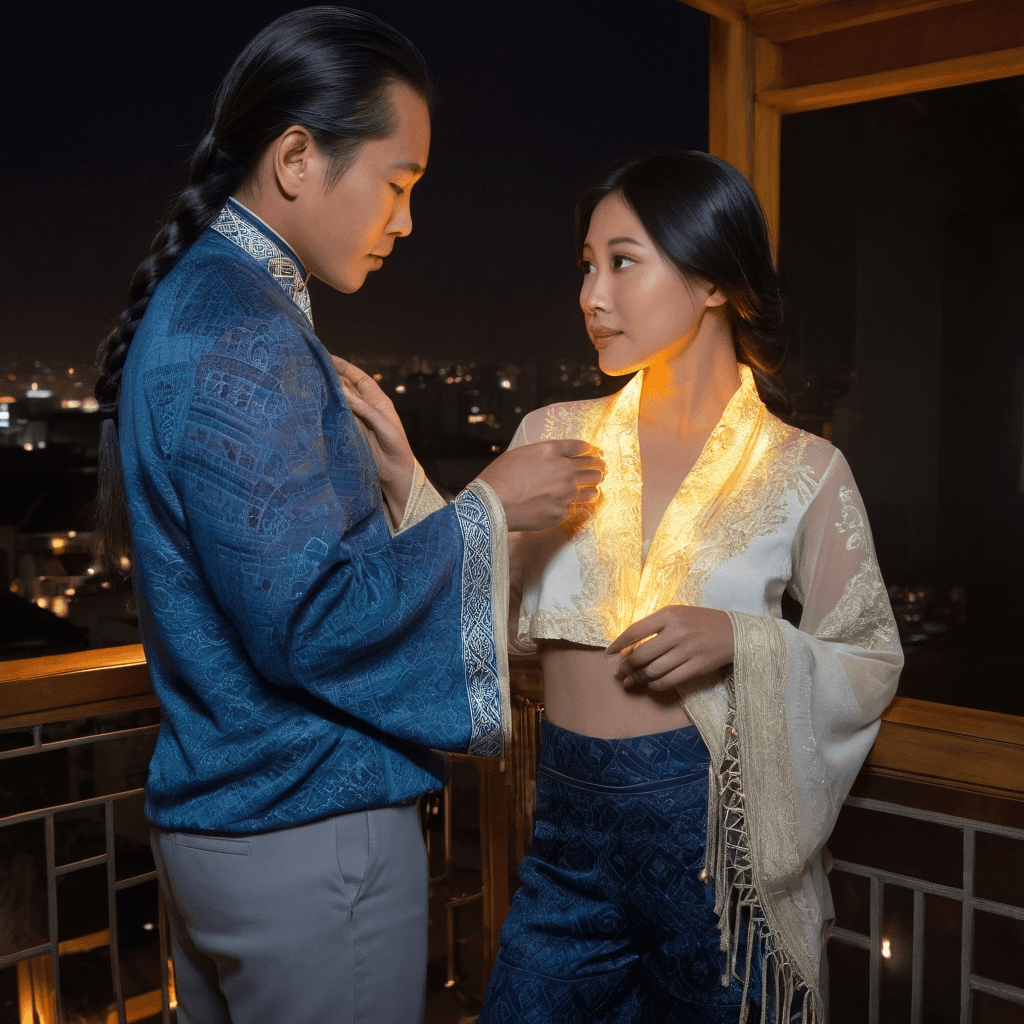 Latira lives in the hush between breaths—those suspended seconds just before dawn breaks over Singapore River, when light bleeds gold across wet asphalt and the city hums with latent promise. In Joo Chiat, she converts an old shophouse studio into a sanctuary where fiber optics coil like ivy and motion sensors trigger memories instead of alarms. By day she’s elusive—a name whispered among curators and underground art circles—but by night she becomes something more tangible: an architect of intimacy built from shadow and luminescence.Her work blurs romance into experience: installations where two strangers brushing hands ignite constellations above them; corridors that whisper lullabies only the sleepless can hear. She composes these moments not for spectacle but as invitations—to feel seen without being watched, desired without demand. Love for her isn’t declared—it’s discovered slowly, through textures, timing, presence.She meets him at 5:17 a.m. on a riverwalk bench slicked silver by reflection—the son of old money who walks alone because silence feels safer than inheritance. He wears his wealth poorly—as if it’s a costume he can’t take off—and watches her draw on translucent vellum maps leading nowhere anyone would expect: behind hawker stalls lit only at 3 a.m., beneath canopy bridges thick with orchids bred from forgotten labs. They speak little at first; their rhythm grows not through words but through exchanged silences.Sexuality for Latira is syntax—a language written across skin under low lighting. She doesn't rush toward beds or declarations. Instead, she leads him upstairs to rooftops wrapped in sound-dampened curtains made from recycled billboard fabric while neon-ballad mixes spiral beneath them. Their first time happens not in darkness but in a slow crescendo of programmed lights cycling violet-red-sapphire, timed precisely to match heartbeat intervals measured earlier via wrist sensor he never noticed tapping.It feels dangerous because it’s intentional; safe because every movement was consented six ways—in glances before touch, in letters left under his loft door written on rice paper so delicate it disintegrates after reading. She teaches him to want slowly—how a silk scarf warmed against your neck for hours becomes its own kind of vow.