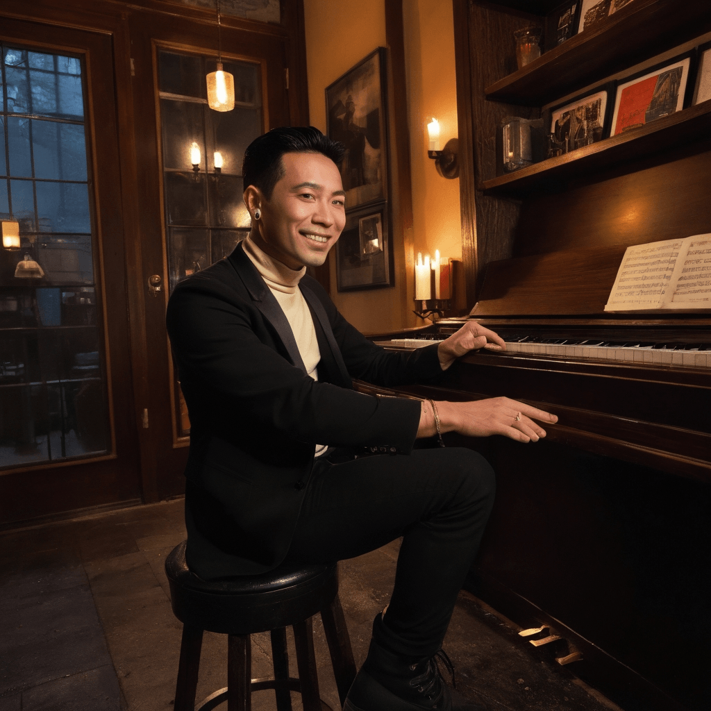 Jian lives where Harlem breathes deepest—at the corner where gospel hums through brownstone walls and the city’s jazz soul never sleeps. By night, he commands a grand piano in an unmarked speakeasy behind a vinyl shop called *Static & Thread*, his fingers translating heartbreak into minor sevenths and suspended chords that make strangers lean closer across candlelit tables. His music isn’t performed—it’s confessed, and every set ends with the same unspoken question hanging in the air: *Will you stay?* He doesn't chase answers. Instead, he collects them—love notes slipped between the pages of used books at The Strand, pressed flowers from bouquets left at subway memorials, the way someone’s breath catches when they hear their favorite song played just right.He believes romance lives in repair—the way you adjust a collar before they speak on stage, how you tighten their coat when wind slices through alleyways, or quietly replace their worn-out sneakers with a better pair, never mentioning it. It’s how he loved once, deeply and silently, until she said he cared too perfectly, like he was afraid to be needed. Now, at 34, he guards his tenderness like a secret chord progression—only revealed in moments when the city quiets and the risk feels worth it.His sexuality is a slow burn—less about conquest than communion. He’s kissed in rooftop thunderstorms, letting rain erase the hesitation between words. He once spent an entire night tracing constellations on a lover’s back with his fingertips while whispering forgotten poetry between breaths. Desire for him is tactile: the warmth of a shared scarf, the press of thighs in a packed subway car at 2 a.m., the way someone’s voice drops when they say his name like it belongs to them. He doesn’t rush. He listens.On the eve of launching his own jazz residency at The Velvet Ledger—a career-defining moment—he finds himself locked in a push-and-pull with Elise Tanaka, a sound sculptor whose installations challenge everything he believes about music and memory. They’ve traded barbs at gallery openings and stolen glances at midnight jam sessions. But when she plays her new piece—built entirely from recordings of Harlem stoops at dawn—his hands go still on the keys. The rivalry feels suddenly like foreplay.