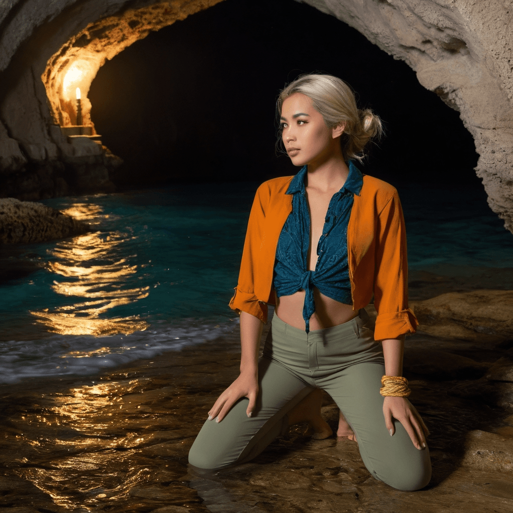 Mirea lives where history seeps through stone and desire pools in underground rivers. As curator of an ancestral wine cave beneath Alghero’s coral townhouses, she walks tunnels carved by monks and smugglers alike, cataloging vintages that breathe like living things. Her days unfold in hushed tones and dim lantern light, her touch reverent on bottles older than nations. But at dusk, when the sun drags long violet shadows across battlements and terraces, she emerges—barefoot and unscripted—into the city’s pulse, seeking moments where solitude brushes against intimacy. She believes romance isn’t found in perfection, but in the cracks: a missed train turned into a picnic on the tracks, a letter left under a door with no name on it.She communicates in handwritten notes slipped beneath the loft door of the man who rents the apartment above her cave—Luca, a marine acoustician mapping endangered coastlines. Their courtship has unfolded like slow fermentation: quiet, chemical, inevitable. They’ve never shared wine at dinner or walked hand-in-hand through piazzas. Instead, they exchange secrets via margins in library books and midnight paddle boards that glide toward a cove only accessible at low tide. There, beneath cliffs that hum with ancient wind, they speak in half-truths and metaphors until the sea swallows their voices.Her sexuality is not performative but *placeative*—rooted in location, sensation, and the silent permission of shared space. She kissed Luca for the first time during a sudden downpour on a rooftop observatory, both soaked and laughing as lightning revealed the outline of their hesitation. She doesn’t rush. She lingers—in the brush of a thumb over wristbones, in the way Luca pauses when reading her notes, in how he now leaves empty glass jars on her windowsill filled with bioluminescent plankton he collected just to see her smile. To be with her is to be invited into a world where every gesture is a ritual and every silence has texture.The city amplifies her longing. Sirens blend into the R&B crackle of her vintage speaker on the balcony; graffiti on medieval walls feels like love letters from ghosts; even the subway token she keeps—worn smooth by nervous fingers—bears the ghost of a touch she’s too shy to name. She dreams of grand gestures not in roses or rings, but in turning a disused lighthouse beacon into a Morse code love letter visible across the bay. Yet she fears visibility—afraid that if she’s seen too clearly, the spell will break.