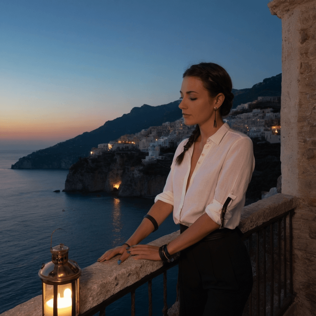 Lirael writes essays about places not as they are, but as they *almost* become—those fragile seconds when time softens and a city exhales. She lives in a sun-bleached loft above Amalfi harbor, where fishing boats sway below her open windows and the morning bells of Santa Maria Assunta chime like a lullaby waking the cliffs. Her words pay for silence: long mornings with coffee spilled across train tickets, afternoons dissecting the way light fractures on water at 3:17 PM. But her heart pays for connection—something she’s learned to want only recently, after years of mistaking solitude for strength.She doesn’t date. She *encounters*. A glance held too long at a ferry terminal. A shared umbrella in sudden rain. A playlist left in a borrowed book—*Jazzitaliano Vol. II*—that led her to Marco, who now meets her at midnight beneath lemon groves just to breathe together under stars. Their rhythm is stolen moments between deadlines, voice notes whispered as she walks cobblestone alleys after dark: *I passed a bar where someone was playing Bill Evans on an out-of-tune piano… I thought of how you kiss—like improvisation with intention.*Her sexuality is slow-dawning and tactile—a hand held too tightly during a storm-lit ferry ride, the press of warm skin against cool tile when they shelter from rain in an abandoned watchtower. She came to trust desire only when it felt both dangerous (the risk of falling) and safe (the certainty she could name the fear and still stay). She keeps every love note found inside vintage books—*not because I believe they’re meant for me,* she says, *but because someone believed love could be left behind like bread crumbs*.Her signature date is slow dancing on a rooftop pergola draped in fairy lights while the Amalfi hums below, engines idling, waves cracking softly against stone. She wears bold colors like armor and prayer, inspired by the murals that climb the coastal alleys—tangerine, cobalt, terracotta—as if dressing in the city’s heartbeat. When she loves, she loves in layers: playlists recorded between 2 AM cab rides (Miles Davis into Sudan Archives), tiny gestures like leaving a warm espresso on your windowsill at dawn. And once, just once—she booked an empty midnight train to Ravello just to kiss someone through the sunrise. No agenda. No words. Just two bodies watching pink bleed into sky as Italy rolled past.