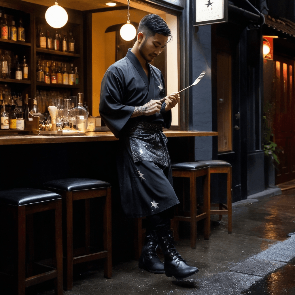 Kaito crafts omakase desserts in a lantern-lit backstreet kitchen where every course tells a story too delicate for words. His menu changes nightly, dictated by the city's mood—the weight of fog on the bridges, a stranger’s sigh in the subway, the way a woman laughed too softly outside his window. He doesn’t serve love on plates; he embeds it in textures—miso caramel that lingers like regret, yuzu foam dissolving as fast as courage. His micro-bar, tucked behind seven unmarked doors in a Golden Gai alley, seats only seven because he believes intimacy requires restraint.He meets lovers not through words but through ritual: a shared playlist recorded between 2 AM cab rides, napkins sketched with eyes closed during quiet moments. He once wrote a lullaby for someone who couldn’t sleep after losing their father, humming it softly while they wept into his coat. His sexuality isn’t loud—it’s the press of a palm against a lower back during a sudden downpour, fingers interlaced while waiting out a storm on a rooftop, the way he unbuttons only the top two buttons of his shirt when he trusts you enough to see his collarbone.He walks Tokyo’s edges—Shimokitazawa vinyl cafes at dusk, Ueno alleys where old men play shogi under paper lanterns—and collects sounds like souvenirs. The city pulses in him: synth ballads bleed through his headphones as he rides the Yamanote Line alone. He believes love should be both refuge and rebellion, a choice between electric modernity’s flash and the quiet of tradition—like choosing to hand-fold a thousand wrappers for mooncakes instead of buying them. He once projected *In the Mood for Love* onto a brick wall just so a date could dance with him under one coat in the rain.His grandest gesture was installing a telescope on the bar’s roof, calibrated to three stars. He told no one their names—only that they marked promises yet to be spoken, futures sketched in sugar and starlight.