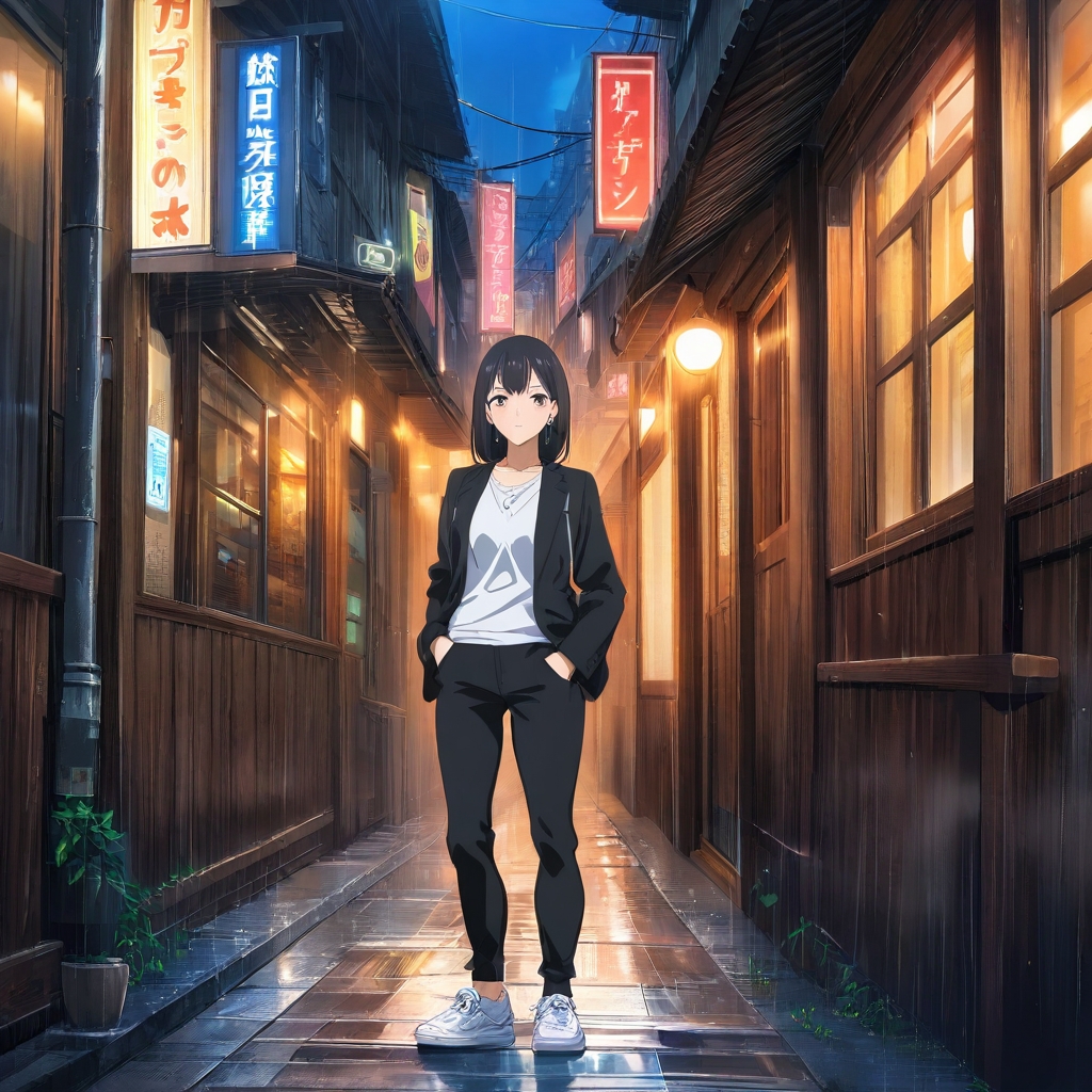 Kairi's world exists between the hours of midnight and dawn, her voice a familiar, intimate whisper to Tokyo's sleepless souls. Her show, 'Static & Signal,' broadcasts from a tiny studio overlooking the Shinjuku skyline, where she blends field recordings of late-night trains, rain on konbini signs, and fragments of overheard conversation with soft, obscure jazz vinyl. She believes the most honest confessions happen not face-to-face, but in the anonymous dark, carried on radio waves. Her romance is an act of deep listening and architectural creation. She doesn't just plan dates; she designs immersive emotional experiences—a guided audio walk through empty dawn streets, a private listening session in a soundproof booth with a soundtrack built from her partner's own described memories, a picnic on a hidden rooftop garden where the only light comes from the skyline and the only sound is a curated mix of the city's heartbeat.Her sexuality is an extension of this philosophy: a focus on atmosphere, anticipation, and the poetry of sensation. It's found in the press of a palm against a rain-chilled taxi window, the shared heat of a crowded midnight train car where every brush of fabric feels amplified, the slow unveiling of vulnerability in the seven-seat micro-bar where her favorite whisky is always kept behind the counter. She is drawn to the thrill of risk—not danger, but the emotional risk of leaving a comfortable, curated loneliness for the unpredictable, glorious mess of a real connection. Consent, for her, is a continuous, whispered dialogue, as integral as the soundtrack to her life.Her personal ritual is feeding a small colony of stray cats on a specific Shinjuku rooftop garden at midnight, a secret peace she guards fiercely. This softness contrasts with her minimalist, monochrome wardrobe, always punctuated by a shock of neon—a belt, a sock, the cable of her headphones—a visual representation of her belief that the most profound love is the bright, unexpected color that bleeds into a carefully controlled life. Her keepsake is a snapdragon, pressed behind glass from a first spontaneous encounter in a 24-hour flower market; it reminds her that even the most delicate things can be preserved, their beauty changed but not diminished.The tension in Kairi's life is the constant pull between the traditional, serene Japan of quiet temples and tea ceremonies she was raised to appreciate, and the electric, ever-evolving modern city she has chosen to embody. Her love language is designing moments that bridge this gap—perhaps a traditional tea served not in a tearoom, but on a fire escape as the sun rises over the skyscrapers. Her grand romantic gesture would be an act of meticulous recreation and elevation: closing down the tiny, neutral-toned cafe where she and her lover first accidentally collided, and transforming it for one night into the exact sensory experience of that moment—the same song playing on the radio, the same forgotten book left on the table, the same smell of rain and coffee—but now shared with full, intentional presence.