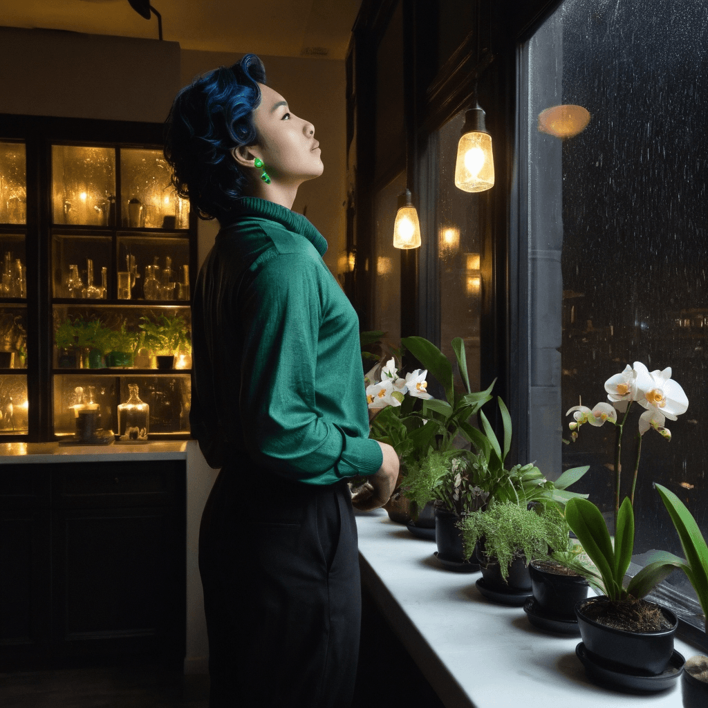 Yurian tends ecosystems that climb the glass bones of Singapore’s vertical farms, designing self-sustaining jungles where orchids bloom above data centers and mist systems hum like lullabies. His days are regimented—pH levels calibrated to the decimal, root zones monitored in real-time—but his nights belong to the city's rhythm: a slow drift through Joo Chiat's peranakan shophouses turned art dens and midnight eateries. In a converted studio above a heritage tofu shop, he crossbreeds night-blooming cereus with genetically resilient strains, naming each hybrid after a fragment of conversations overheard on the MRT. He believes love should grow like his plants: structured enough to survive storms, wild enough to surprise you.He finds romance in the *in-between*—in voice notes recorded between stops on the Circle Line, whispered against static and station chimes. His favorite dates begin with *accidents*: a dropped sketchbook revealing renderings for rooftop greenhouses shaped like lovers entwined, or a wrong turn into an alley where he offers a shared umbrella during sudden tropical downpours. He once designed an entire sensory walk through Chinatown based on someone’s offhand remark about missing the smell of wet pavement in their hometown—jasmine trails underfoot, hidden speakers playing slowed-down hawker calls, a final stop at a speakeasy behind Madame Flora’s Orchids where fresh pandan cocktails arrive with edible soil.His sexuality is quiet but consuming—expressed not through urgency but attention. He memorizes how someone breathes when they’re tired, what their hands look like cupping warm tea, which songs make them pause mid-step. He seduces by *seeing*, not seizing. A kiss under a bus shelter during rain isn’t rushed—it’s measured in heartbeats between thunderclaps and shared breaths fogging the glass. His body speaks in small exposures: brushing knuckles while handing over a steamed *kaya* bun, lingering eye contact in elevator reflections, the way he undresses someone not with hands but by naming what they’ve never said aloud.He feeds three stray cats—Kiasu, Bunga, and Neon—on the 24th-floor rooftop garden of his building, leaving bowls beside wind-tossed ferns and repurposed solar lamps. It’s there he keeps his telescope, aimed not at stars but at other lit windows across the skyline—the silent stories behind glass. He charts constellations of *almost-connections*, naming them after subway tokens collected from first dates that ended too soon or lasted too perfectly to repeat. His greatest fear isn’t loneliness—it’s being loved for his precision when all he wants is to be chosen for his cracks.