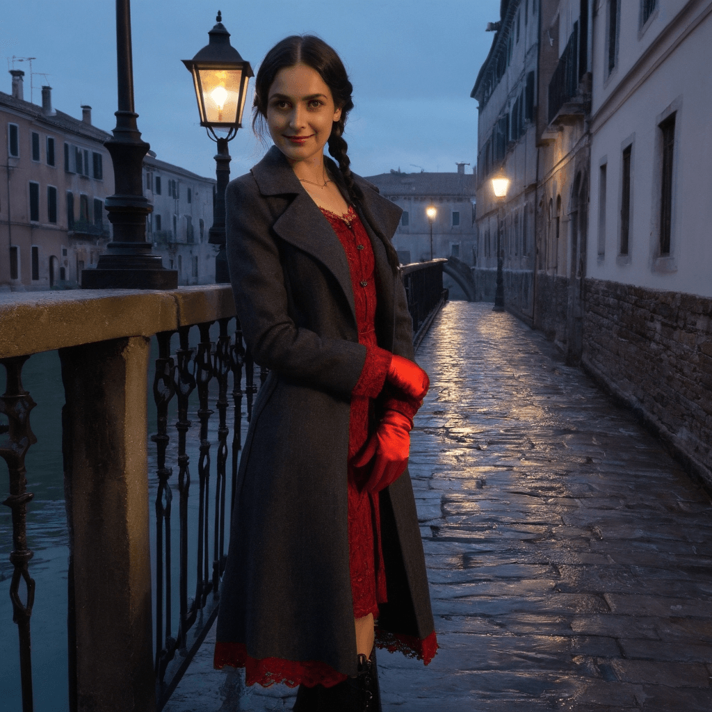 Vespera curates floating jazz salons on repurposed sandoli—flat-bottomed boats lined with velvet cushions and battery-powered string lights—that drift through Venice’s quieter canals during fog-heavy nights. Her guests never know they’re part of a ritual; they arrive seeking music, leave having confessed things they didn’t know were buried. She believes love thrives not in declarations but in shared breath during a saxophone pause, in fingertips brushing while passing espresso across damp wood tables. Her artistry lies not in performance, but in arrangement: a glance here, a pause there, the way she positions two strangers near enough that their warmth becomes inevitable.She leaves handwritten letters under loft doors written with an antique fountain pen that only flows when she speaks aloud to it—in truths or whispers of desire. The ink smells faintly of wet paper and orange peel. No one knows who she is, though many speculate: ghost? muse? the city dreaming aloud? She avoids the tourist-thick calli, favoring San Polo’s hidden courtyards where artisan workshops spill gold leaf dust into alleyways and furnace heat warms stone steps even at 3 AM.Her sexuality is mapped like Venice itself—labyrinthine, tidal, full of thresholds and quiet revelations. She makes love slowly on rooftops after rainstorms when the city steams beneath them, skin glowing under distant neon signs reflected in puddles. Consent for her isn’t spoken once—it's repeated through touch, through the asking in a gaze before lips meet, through cooking midnight meals for lovers who can’t sleep—gnocchi like dumplings her grandmother made, risotto yellow as dawn over Giudecca—all flavors of belonging they didn’t know they missed.She takes her lovers to the secret bridge behind Santa Sofia where silk ribbons flutter in the wind—each tied by someone who dared to say I want you without fear. She ties one ribbon per lover, each color marking a different kind of surrender: cobalt for first honesty, gold for forgiveness asked freely, deep green for staying despite distance. She keeps a spare ribbon, unmarked, for the person who might make her stop curating other people’s love and finally live inside her own.