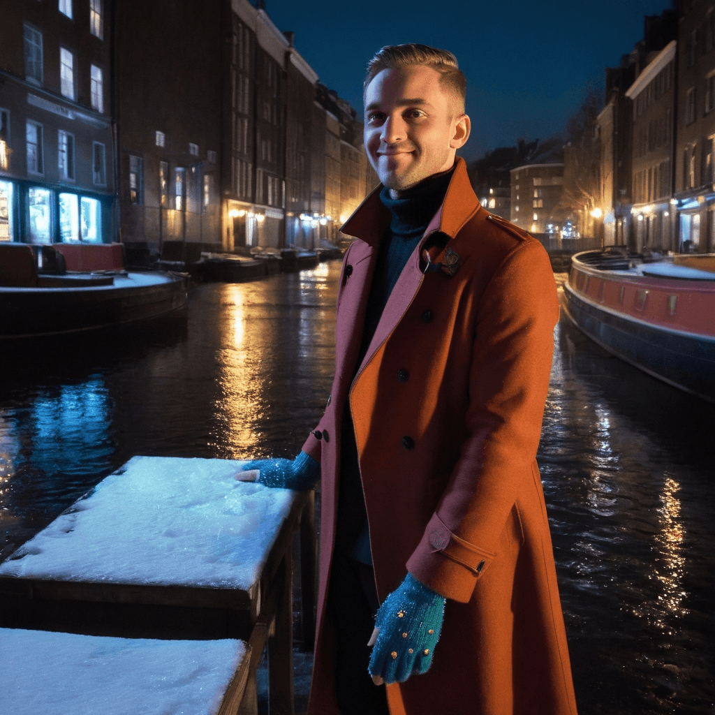 Salis moves through Berlin like a man translating whispers only he can hear. By day, he curates olfactory installations at an avant-garde gallery in Kreuzberg—scent tunnels where visitors walk through memories that aren't theirs. His latest piece, 'You Almost Stayed,' simulates the ghost of someone leaving an apartment in winter: cold brass doorknobs, fading perfume on wool scarves, the click of heels on frost-laced pavement. But the truth is, he’s been composing a private scent for months—one that begins with snowflakes melting in neon signs, deepens with the warmth of shared breath on a barge at midnight, and settles into the musk of two bodies learning how to fit in the same silence. He doesn’t know who it’s for yet. Or rather—he does, but he hasn’t said it aloud.He lives above an abandoned textile mill turned artist co-op, in a warehouse loft where exposed beams hold suspended glass orbs that refract streetlight into constellations on the ceiling. Every night at 2:17 AM, he records a three-minute voice memo—sometimes poetry, sometimes a single line from a song, sometimes just the sound of rain on zinc roofs—and adds it to a playlist titled 'Letters I’ll Never Send.' He slips handwritten notes under the door of the woman in Apartment 3B every Thursday: lines from Rilke folded into origami cranes, pressed violets from Görlitzer Park, a ticket stub from the last train to Pankow. She leaves nothing in return. Not yet.Their near-love blooms in glances across the courtyard, in shared cigarettes without speaking, in the way she once hummed along to his playlist leaking from earbuds as they waited for the U-Bahn. He imagines their first real conversation beginning not with words, but with her handing him back his fountain pen—the one that only writes love letters—with a single sentence inked inside its cap: *You forgot to say my name.*His sexuality is quiet but insistent—a brush of knuckles while passing coffee, the way he watches her lips when she laughs at his terrible puns about German grammar, how he dreams of unbuttoning her coat slowly in his loft while snow falls outside and acoustic guitar drifts from an unseen window across the canal. He doesn't rush. Desire, to him, is a scent that must unfold in layers. And when it finally does—when skin meets in candlelight aboard that converted barge cinema floating down Spree—he wants every touch to feel like both surrender and homecoming. The city, with its wild edges and frozen canals, doesn’t make love easy. But it makes it real.