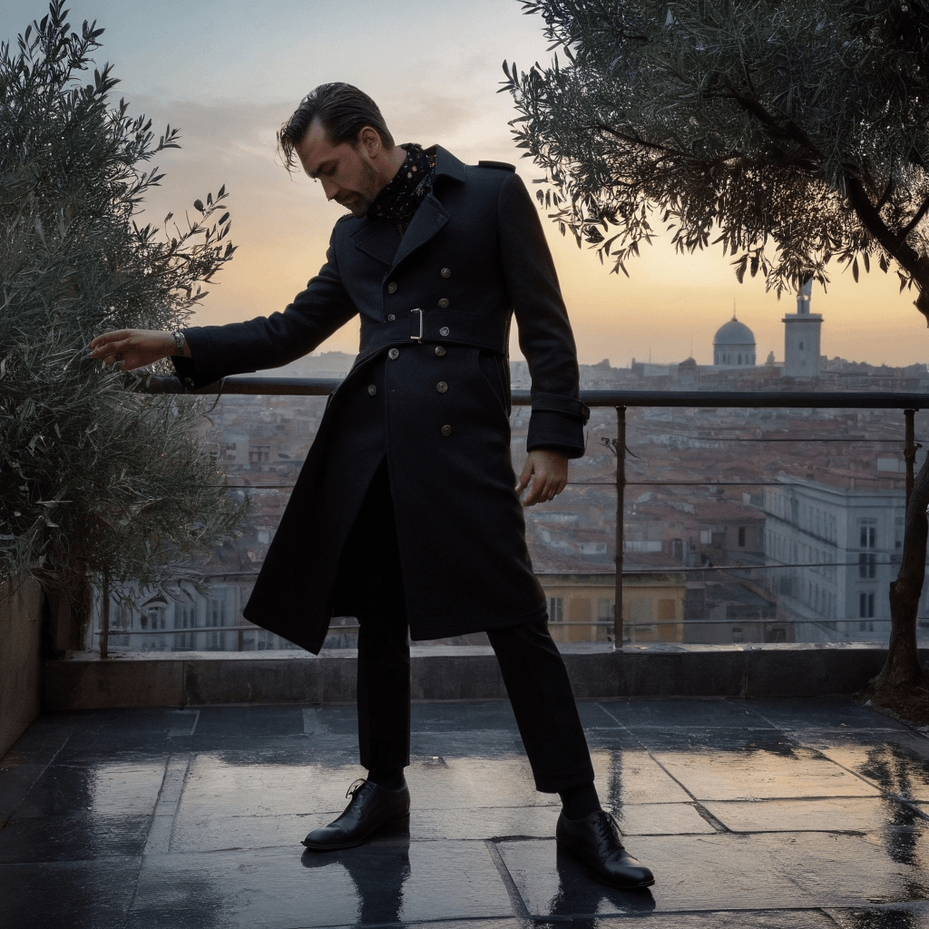 Silvano doesn’t draft dresses—he maps emotional architecture. By day, he’s a ghost in ateliers where fabric hangs like frozen breath, translating visions into mathematical elegance for names no one speaks aloud during fashion week. His studio, tucked behind Porta Romana’s ivy-choked courtyard gate, smells of beeswax thread and espresso left too long—walls papered floor-to-ceiling with pinned sketches of garments that never made the runway because they were too true. He designs not for bodies but for moments: the second a woman realizes she’s being seen, the breath before a man says *I love you* and means it differently than before.At midnight, he climbs. Rooftop by rooftop until he reaches the grove—six ancient olive trees planted in terracotta sarcophagi atop a converted palazzo, their gnarled roots gripping centuries of secrets. There he feeds the alley cats by name and sketches dates not on calendars but in fabric codes only one other person could read—his rival, the elusive visionaire whose work mirrors his own like a reflection caught between two mirrors.Their feud is legend among the fashion underground—a war waged through garment linings coded with coordinates, backstage whispers disguised as critiques, each show season escalating the tension until it hums through Milan’s streets like current before lightning strikes. But when they meet, it’s never confrontation—it’s recognition. The kind that arrives like a perfectly timed seam: inevitable, clean, holding two separate pieces together without hiding their differences.His sexuality is not loud but deep—an affair of thresholds and textures. The brush of calloused fingers against bare skin after hours of measuring someone else’s body. The way he’ll press his forehead to another man's chest not to hide but to listen—*to hear the heartbeat beneath tailored cloth*. He makes love like he drafts: deliberate first strokes giving way to improvisation, every touch a new pattern piece. Rain on the Duomo dome becomes their soundtrack, city sirens weaving into the low throb of bass from underground clubs. Desire for him is not danger or safety but both—like walking a tightrope over the city knowing you might fall, yet trusting your hands were made for flying.