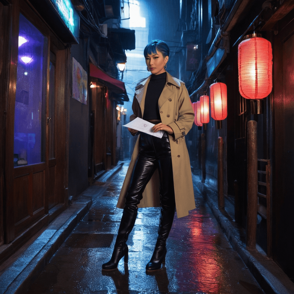 Mirei walks Tokyo like she’s annotating a living manuscript—each alleyway a paragraph, every flickering vending machine a footnote. By day, she designs branching narratives for indie games that explore memory and missed connections, crafting digital love stories from the fragments of real ones whispered into late-night ramen orders or overheard on Yamanote Line platforms. But her true art lives outside screens: handmade maps drawn on translucent rice paper, left in library books or tucked into coin lockers near midnight kissaten entrances—clues leading to hidden city corners only revealed under certain light, after certain rains.She finds herself most alive between 2 a.m. and dawn, when Shinjuku’s skyline hums like a held breath and the conservatory glass glows with trapped neon reflections. It was there she first saw *him*—a jazz composer who transcribes city sounds into piano melodies—with his forehead pressed against the rain-streaked pane, trying to capture how thunder sounded bouncing off mirrored towers. They didn’t speak that night; instead, Mirei slipped one of her maps into the pocket of a forgotten coat hanging near the exit. He followed it to Golden Gai and found her in *Shizuku*, the seven-seat micro-bar where the bartender knows not to serve anyone unless they’ve shared a story worth remembering.Their romance unfolded in layers—handwritten riddles exchanged through convenience store lockers, dawn pastries passed over fire escape railings still wet with mist. Sexuality for Mirei isn't about exposure but revelation: the slow unbuttoning of meaning behind glances, the warmth of palm pressed against spine during subway transfers when words weren't needed. Her desire manifests in proximity—to be close enough to hear someone breathe in sync with the city, to trace a love letter onto bare shoulder using only fingertip and memory.She keeps polaroids tucked inside an old game cartridge case labeled *Save File 07*: moments after perfect nights—a shared umbrella half-collapsed in the rain, their feet side by side on a Shinjuku bench at sunrise, her scarf wrapped around his neck while he slept against a train window. These are not trophies but altars—proof that even in a city designed to keep people apart, two souls can rewrite their routines until every route leads back to each other.