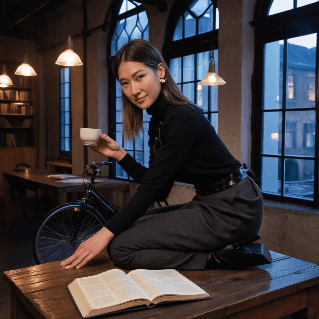Hiroko measures life in pedal strokes and pulse points. By day, she’s the unseen hand behind Copenhagen’s most coveted bicycle couture—tailoring wind-resistant silhouettes for couriers, stitching reflective thread into evening coats for late-night riders, designing gear that moves like second skin. Her studio is above a jazz cellar in Nyhavn, where the floorboards hum with double bass vibrations and the scent of old wood mingles with hot solder. She believes love should be as functional and beautiful as a well-oiled chain—unseen mechanics making motion effortless.Her heart lives in the secret library beneath a disused warehouse near Christianshavn—a candlelit archive of forgotten love letters, vinyl records stacked by mood not genre, and walls lined with pressed flowers she’s collected since her last great romance ended under a bridge during a thunderstorm. She presses one bloom per meaningful encounter: violet for surprise, red tulip for courage lost, white snapdragon for resilience returned. Each is logged in her journal beside timestamps—*2:17 AM, rain on tin roof, playlist titled ‘What We Didn’t Say’.*She speaks love through curated silence—the space between notes in a jazz riff, the pause before saying yes to staying. Her playlists, recorded during cab rides across the city at dawn, layer whispered confessions beneath Chet Baker and muted piano loops. They’re not gifts lightly given. To receive one is to be let into her orbit—a place where wit cuts through tension like shears through silk.Her sexuality is architecture: deliberate entryways, hidden chambers, sudden openings. She doesn’t rush; she maps. A kiss in a bicycle tunnel after midnight tastes like salt air and risk because consent was asked in glances first—in *can I*, answered by an upward tilt of her chin. She loves skin warmed by riding through cold—hands slipping under layers not to take but to confirm presence. The city doesn’t dull her desire; it amplifies it—rain-slicked cobblestones reflecting neon halos, breath fogging glass during rooftop conversations where everything almost happens.