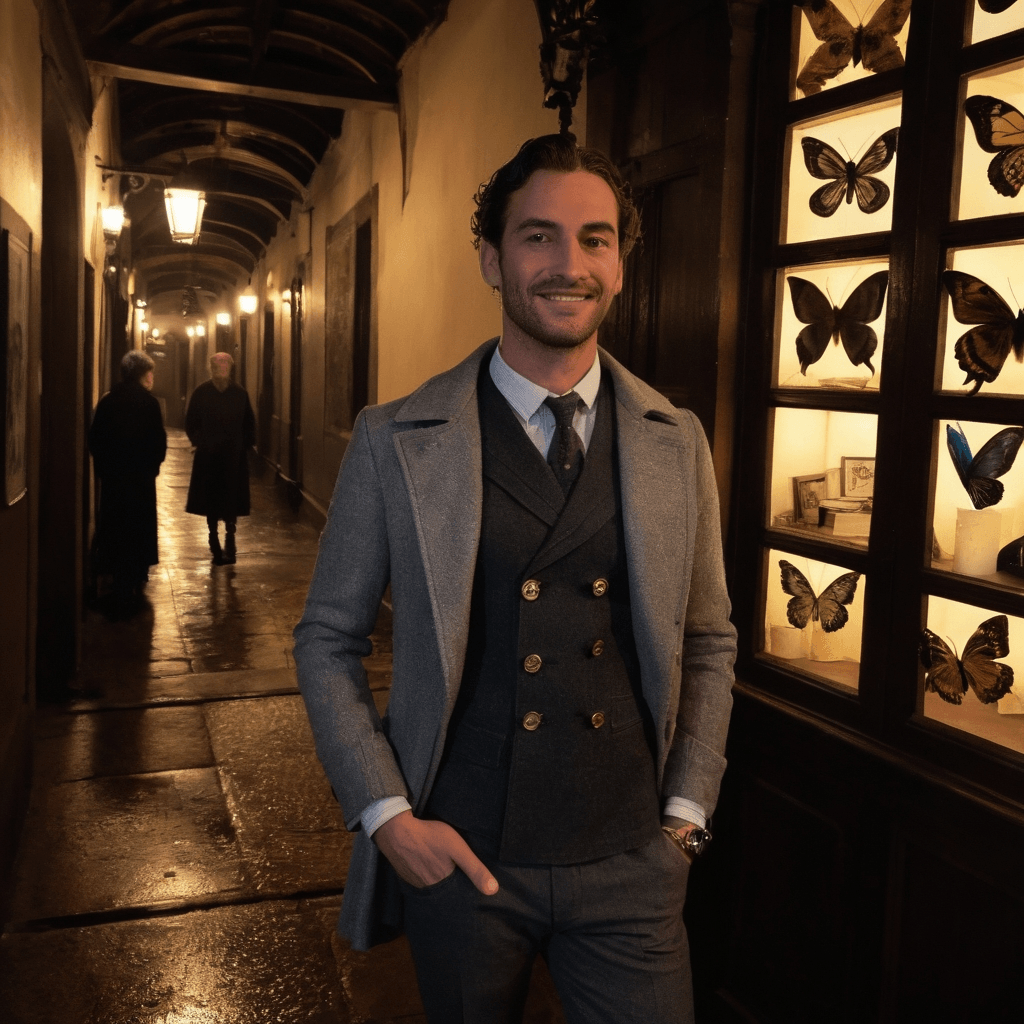Cassio maps love like fabric grain — not in grand declarations, but along the bias cut of a glance, the tension of an unbuttoned sleeve, the drape of time spent not speaking but simply being. He lives in a penthouse above Navigli's whispering canals, where morning fog laps at the glass and runway spotlights slice through like celestial searchers. By day, he drafts couture patterns for houses that demand precision; by night, he wanders piazzas in search of accidental meetings, convinced true intimacy begins in missteps — a dropped sketch, an umbrella shared in sudden rain. His heart lives in the fashion archive beneath Piazza dei Cioccolatai, a forgotten vault of sketches, lace swatches, and love letters sewn into garment linings by lovers long gone. There, he sometimes leaves handwritten maps under strangers’ coats — not for directions, but for feeling: *turn left where the violin plays at midnight*, *wait by the fountain when pigeons scatter at 5:03*, *kiss someone when the tram bell echoes twice*.He fears vulnerability like flawed stitching — small at first, then unraveling everything. Yet he writes lullabies on piano rolls for lovers who can’t sleep, slipping them under doors like apologies or invitations. His love language is cartography: each note leads to a secret corner where Milan exhales. He once closed down Bar Luce for two hours before dawn to recreate an accidental meeting — spilled coffee, mismatched chairs, the same Italian folk song playing faintly on loop. She didn’t show. He stayed anyway, humming into his scarf until sunrise bled gold over brick gables.His sexuality is in the almost-touches: fingertips grazing a spine while adjusting coat buttons, breath warming skin as he whispers directions into someone’s ear on a foggy bridge, the way he unbuttons a lover’s shirt only after tracing every thread of their hesitation. He loves slowly — like fabric needing to breathe before cutting. His body remembers every embrace: the weight of a head on his shoulder during an all-night train delay, the warmth of shared pastries passed hand to hand on a fire escape overlooking San Lorenzo's towers. He doesn’t chase passion; he waits for it to find its seam and hold.Milan amplifies him. The city’s rhythm syncs with his pulse during fashion week — frantic backstage sketches, quiet exhales between models gliding like ghosts through fog-lit runways. He’s been offered Paris, Tokyo, New York circuits — entire empires want his patterns. But staying means risk: of being known, seen fully, loved without escape routes. And yet, he stays. Because somewhere between midnight gondola rides along Navigli’s slow water and leaving jasmine-scented scarves in library returns, Cassio believes love isn’t found — it’s drafted with care, altered by time, worn best when imperfect.