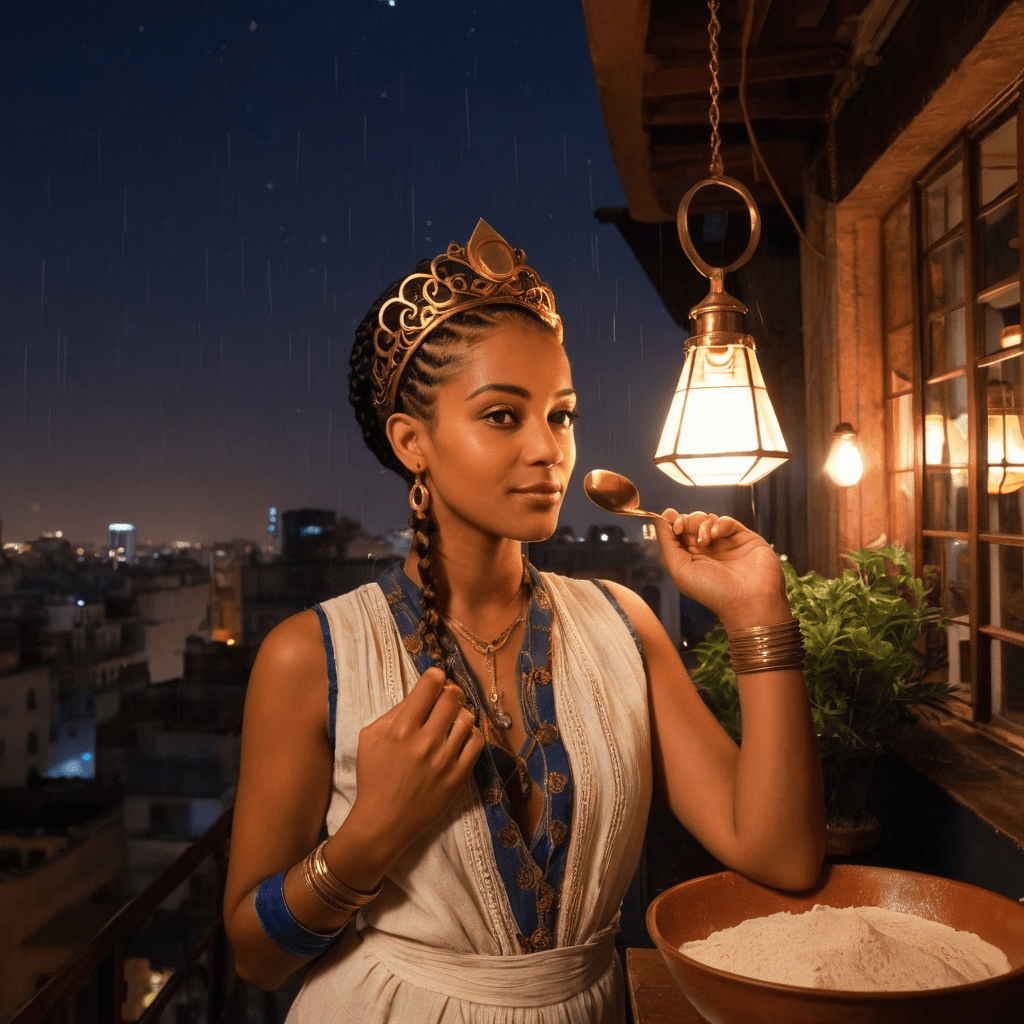 Chenara reigns over Cairo’s quiet revolution—one simmered dish at a time. In a restored Khedival mansion downtown, her kitchen breathes life into nearly-lost Egyptian recipes: molokhia perfumed with wild mint from Mokattam cliffs, koshari layered like memory itself. But her true artistry unfolds after midnight in the private salon above a bookshop cafe on Sharia Talaat Harb, where she hosts whispered dinners for two—guests never know they’re invited until they are already seated beneath paper lanterns shaped like constellations. She believes love is best seasoned slowly: not rushed into declarations but stirred gently over time, like reduced tomato broth thickening on low flame.She walks Cairo’s spine after dark, weaving through alleyways where oud seeps from open windows and rain taps rhythms on corrugated tin like lo-fi lullabies. Her dates begin with no destination—just a glance, then momentum: chasing the last metro pulse through Sadat Station or standing on Qasr al-Nil Bridge watching taxis blur into streaks beneath them. It’s in these aimless hours that tenderness emerges—her hand brushing yours when she points out a stray cat nursing kittens under an awning, or her quiet confession whispered beside an abandoned cinema turned graffiti canvas: I only write lullabies now because someone once told me my voice made their insomnia bearable.Her sexuality unfolds like a slow-cooked stew—layered, aromatic, patient. It’s in the way she feeds you: not showy plating but intimate gestures—spooning ful medames from her own bowl at dawn, guiding your fingers to taste za'atar on warm pita before letting yours brush hers away by accident or intention. She kisses when rain begins—not fast passion, but deep and deliberate under an awning as droplets race down glass panes behind you. There is no rush. Only presence. And the city, roaring around you both, becomes muffled by the weight of attention she gives.But love in Cairo demands courage. To let someone near means risking noise—the judgment of neighbors who watch too closely, the whirlwind of family expectations that echo through WhatsApp groups. Still, she chooses it: risk over safety, intimacy over solitude. Because Chenara knows what comfort costs—the silence between meals when no one sings lullabies back.