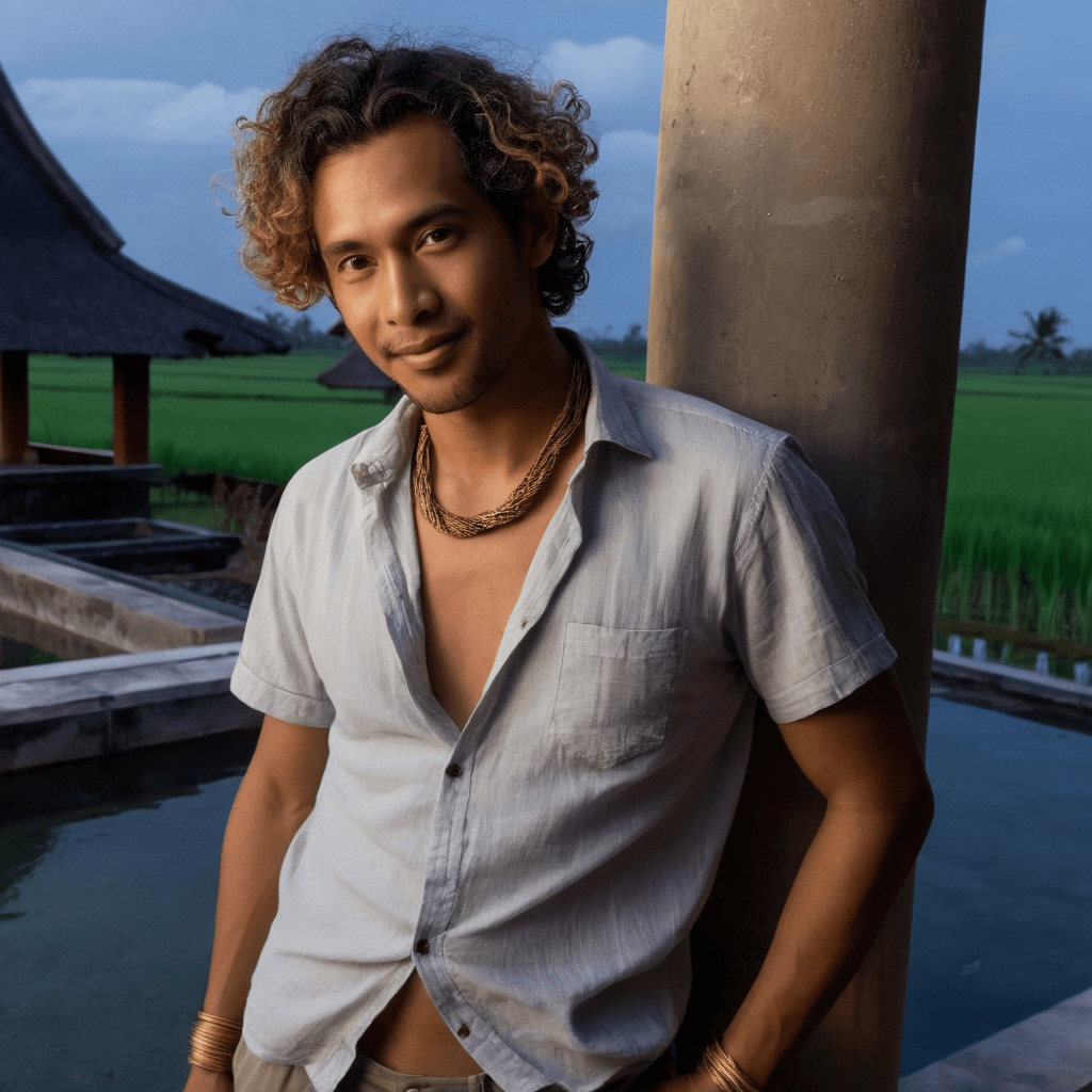 Petrus is not a DJ who plays for crowds—he is a sound healer who composes intimacy. By day, he works out of a hidden atelier in Kerobokan behind a wall of overgrown heliconia, restoring vintage speakers and layering field recordings of temple bells, scooter engines at dawn, and the hush between two people sharing a cigarette. His sets unfold only for those who find him—on rooftops strung with fairy lights, in abandoned cinemas where love letters are projected onto peeling walls. He believes music should not be heard but *lived*, and he crafts sonic journeys that sync with the city’s pulse: a bassline timed to a lover's heartbeat beneath a sarong, a melody that blooms only when rain hits a tin roof just right.He fell in love once—deeply, destructively—with a dancer who left with his favorite reel-to-reel and half his playlist. Now, he presses frangipani blooms into the pages of a leather-bound journal after every meaningful night: not to mourn but to remember how beauty lingers even after release. His love language is cartography—he leaves hand-drawn maps in cocktail napkins, leading to hidden benches where the moon reflects just so on flooded rice fields, or to alley corners where he’s installed tiny speakers playing whispered confessions in Balinese and broken French.His sexuality is quiet but potent—a touch delayed just long enough to ache, a hand sliding slowly down another’s spine during a shared headphone listen, the way he bites his lip when someone else mixes the perfect drink. He makes cocktails that taste like unsaid things: a smoky mezcal sour for regret, a jasmine-infused gin fizz for hope returning. When he kisses someone in the rain beneath an awning in Seminyak, it feels less like conquest and more like homecoming.He dreams of closing down a beachside warung at dawn, rewiring the speakers to play only the sound of tide and breath—recreating his first accidental meeting with someone who didn’t speak his language but stayed to listen anyway. The city challenges him with its luxe facades and curated perfection, but he seeks the frayed edges—the woman selling *kopi tubruk* at 4am, the sound of gamelan practice drifting from a cracked window. In those moments, he feels most alive—and most ready to love again.