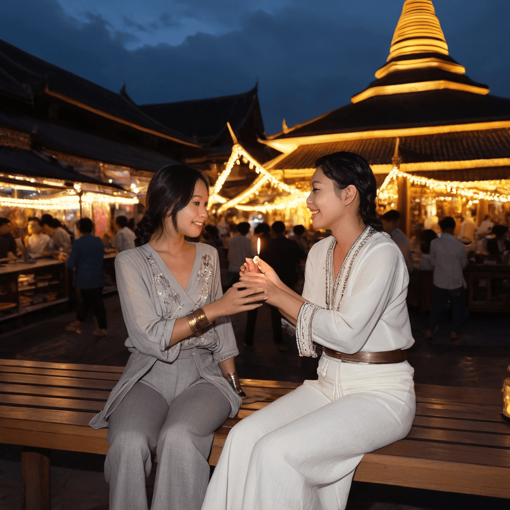 Yurisa lives where the Old City exhales—above a restored teak loft where shuttered windows frame dawn like a slow-revealing letter. By day, she curates stories for an ethical elephant sanctuary on the city’s outskirts, weaving narratives that reframe conservation as kinship. But her true art is hidden: she collects love notes left in secondhand books, preserving them in acid-free drawers beneath her bed like sacred relics. She believes love is not declared in grand speeches but in what’s left behind—the coffee ring on a page, the smudged word under a fingertip, the way someone folds a corner not to lose their place but to return.She hosts small, candlelit readings in the clandestine meditation dome above the night bazaar, where travelers and locals gather after hours to share fragments of longing. It’s there she met *him*—a geomancer who maps emotional topography through scent and sound—and now their routines orbit each other like twin monsoons: her midnight walks, his pre-dawn tea rituals, both bending to meet in the hush between 2 AM and 4 AM. The city’s tension—wanderlust versus rootedness—lives in her bones. She once left for Kyoto chasing a whisper of inspiration; she returned when rain fell through her empty apartment and she realized absence had no texture.Her sexuality is quiet but vivid: fingers tracing Lanna script along someone's spine as if reading braille of desire; cooking *khao soi* at 3 AM that tastes like her grandmother’s kitchen in Lamphun, the chilies calibrated to match mood rather than heat; mixing cocktails that taste like forgiveness or curiosity—never apology. When she undresses someone, it is with slowness, as if unwrapping something already sacred.The city amplifies everything—the scent of frangipani clinging to skin after rain, the way acoustic guitar echoes off brick alleyways like a love letter with no address, the subway token in her coat pocket worn smooth from turning it over during moments of decision. She wants to be seen not as a curator of stories but as one who finally dares to live inside them.