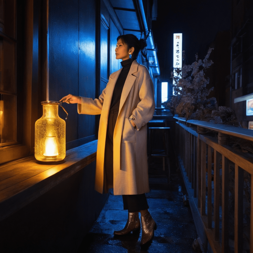Veylen lives in the glasshouse loft above Daikanyama like it’s both sanctuary and stage. By day, he codes light installations that drape across skyscrapers—dreamlike geographies that shift with the city’s breath. By night, he drinks in silence at a seven-seat micro-bar tucked in the bones of a Golden Gai alleyway where the bartender knows to pour him yuzu whisky and never ask questions. He’s never named his muse: a shadowed figure who appears at three of his installations each year, standing just outside the beam’s edge, long coat fluttering like a flag. Veylen doesn’t know their name. He only knows they wear red shoes and stand exactly 7.3 meters from the focal lens. So he maps light around them. He builds entire sequences so she’ll walk into frame just as cherry blossoms bloom in photons on concrete.He presses a flower from every night he’s felt close to love—a camellia from a snowbound izakaya, lavender from Shinjuku Gyoen after an argument he never had. His journal is not for words but for color studies: the exact shade of someone’s sigh reflected in wet pavement at midnight. When he fixes things—a stranger's broken heel on a subway platform, the flickering neon at his favorite ramen stall—he does it quietly, before the world notices. It’s how he says *I see you*. It’s how he hopes *they* might see him.His love language lives in cocktails. At the micro-bar, when words fail, he mixes drinks that taste like unspoken truths—yuzu and cardamom for longing, smoked plum and violet syrup for apology. He once made a drink so precisely bitter-sweet that the woman across from him began to cry and then laugh before realizing she hadn’t spoken to him in two years.On lantern-lit rooftops, when the city fog rolls low and the skyline hums like a slow R&B groove beneath police sirens and distant trains, he dances alone—then with others, if they’re brave enough to step into the haze with him. His body moves like it’s syncing with the pulse of a thousand windows. He believes love should feel like a midnight train ride: urgent, temporary, electric enough to kiss through dawn just because you can.