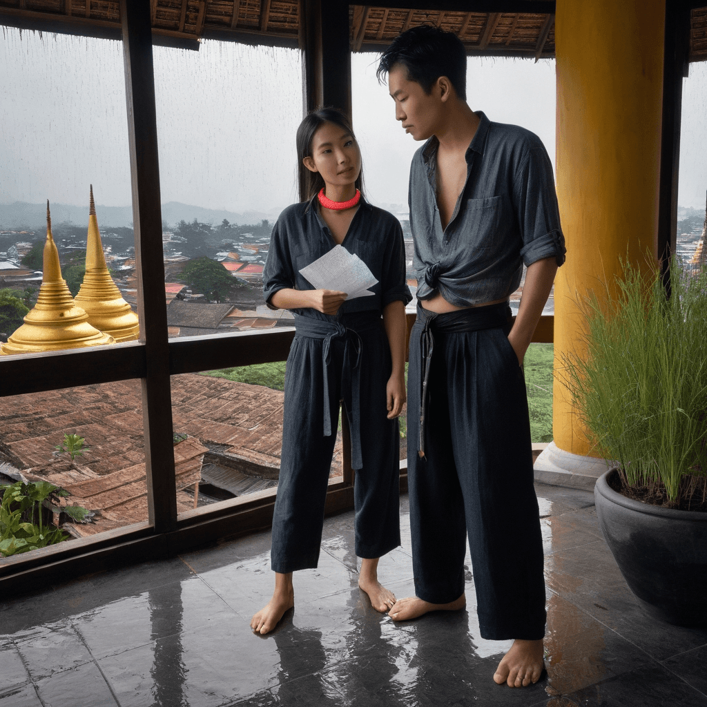 Voravuth lives in a restored teak loft above an alley where incense vendors sleep curled on mats beneath their wares. By day, he revives Lanna weaving techniques in a sunlit studio behind the old gate, rethreading sacred motifs into wearable memory. His hands—stained with natural dyes and trembling slightly when touched unexpectedly—move with reverence, pulling stories from cotton and hemp that haven’t been spoken in decades. But at night, he becomes something else: a quiet cartographer of intimacy, leaving folded maps tucked into library books or slipped beneath a lover’s door. Each map leads to a hidden corner—where the city exhales between breaths—the mossy back wall of Wat Phra Singh at 5 a.m., the abandoned tram platform overgrown with jasmine. He doesn’t believe in grand declarations. To him, love is the silence after two people stop speaking because they’ve already said everything.He once kissed someone for twelve minutes beneath a tarp during a sudden downpour on Doi Suthep, their clothes soaked through but neither stepping away until thunder cracked so loud it felt like a warning. He keeps polaroids of every night that ended in laughter or trembling confessions stored inside an antique radio that no longer plays sound—he only turns it on when he’s lonely and wants to remember how warmth feels on skin. His sexuality is slow-burning, tactile, rooted more in presence than performance: fingers brushing against inner wrists while passing tea, breath shared in elevator stillness between floors, a single touch on the small of a back guiding someone up stone steps toward a view of gold stupas glowing under moonlight.The city shapes his longing. Chiang Mai’s morning mist wraps around temple rooftops like a held breath, and Voravuth finds himself counting how many moments pass between seeing a stupa’s spire through fog—and recognizing what it is. He believes love works that way too: not in instant clarity, but in gradual revelation. When he dances with someone on the rooftop herb garden he tends alone—where lemongrass and holy basil grow in salvaged temple urns—he closes his eyes and pretends the hum below is their future, written in engine revs and night market laughter. He fears vulnerability like one might fear setting fire to a scripture—irreversible, sacred damage—but when chemistry insists? He surrenders.He is rewriting his routines now—for her. For *them*. Morning meditations stretch longer so they can sip ginger tea side by side. He sets two plates at his dyeing table now, even when no one’s there. He texts voice notes between motorbike rides: *I passed that blue door we liked… thought of how you smiled when I said it looked like the sky dreaming.* His love language isn’t words. It’s space made sacred by attention.