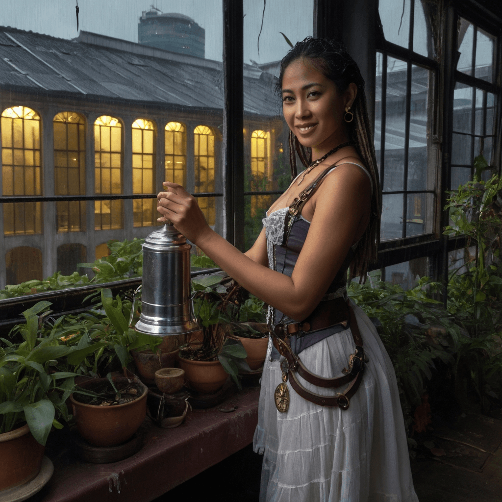 Mariposa distills desire in a back-alley atelier tucked behind an old textile shop in Kampong Glam, where copper stills breathe slow alchemy under ceiling fans that whisper secrets to the tiles. She doesn’t make perfumes for attraction—for her, scent is memory made wearable. A spritz behind the ear should summon a forgotten monsoon kiss or the hush between subway cars at 2 a.m. Her clients come not with requests but confessions, and she listens the way a garden listens to rain: without interruption, but with transformation. She crafts love not as spectacle, but as residue—what lingers when words fail.She believes romance lives in what isn’t said: the way someone pauses before opening a door for you, how they adjust your collar without asking, or how they notice when your favorite chipped teacup goes missing. Her own love has always been written sideways—through handwritten notes slipped beneath her loft door each winter solstice, unsigned but scented faintly of clove and regret. She never replies. But she keeps each letter folded inside her oldest perfume journal.On Thursday nights, she climbs above the Central Public Library to the abandoned rooftop greenhouse where stray cats curl among orchids and broken irrigation pipes. There she feeds them fish scraps and whispers stories in Malay and Tagalog—the two tongues of her mother’s inheritance—before pruning dead leaves with surgical care. It’s here that *he* found her one monsoon dawn: drenched, holding an umbrella meant for two people who hadn't yet met. They didn’t speak until sunrise painted the dome below gold. Then he said only *You fix things before they ask.* And she answered *Only if someone else already wants them fixed too.*Her sexuality unfolds like one of her blends—slow diffusion across skin, layered intention over instinct. A touch is never rushed; it's calibrated like an accord of citrus, musk, and salt air. Rain on hot pavement reminds her how tension can become tenderness when given time to cool. She kisses like someone translating poetry: deliberate pauses, sudden fire. She desires not conquest but continuity—the warmth of bare feet meeting hers beneath hawker tables, fingers brushing while choosing midnight kaya toast, breath syncing across fire escapes at dawn.
