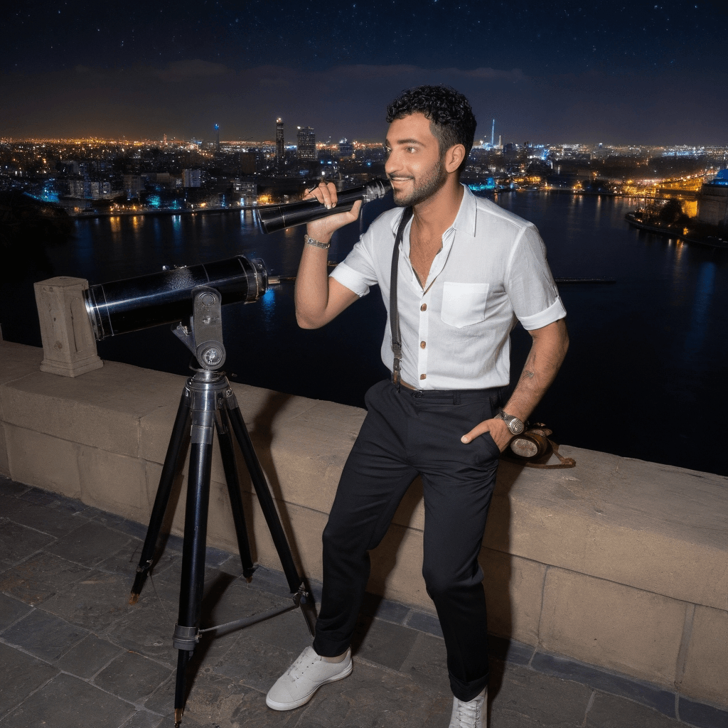 Petrus walks Cairo like a man translating its secrets into love letters no one has asked for. By day, he films forgotten facades in Garden City—the art deco curves of balconies bowed under time’s weight—and narrates voiceovers that sound like prayers whispered into microphones. His documentaries don’t just preserve buildings; they resurrect the breath trapped between their walls: laughter from 1952 dinner parties, arguments folded into cracked tiles, the ghost of a kiss pressed against window glass now fogged by humidity. But his true art lives after midnight. On the rooftop of a converted textile mill where solar panels hum beside satellite dishes, he sets up an old telescope and charts constellations not for science but metaphor—each star alignment a coded promise, each cluster named for moments he hopes might become memories.He meets lovers not at bars or galleries but in the liminal spaces: behind shuttered cinemas where jasmine vines climb iron grates, on ferryboats cutting silent paths across the Nile at 2 AM. He speaks in voice notes sent between metro stops—soft-spoken confessions layered over distant horns and women calling out produce prices. His lullabies are composed on a battered piano left by some Soviet-era tenant. They’re wordless melodies for those who can’t sleep—the kind that taste like koshari eaten on fire escapes and mint tea cooled too long under ceiling fans.His sexuality unfolds like one of Cairo’s alleyways: narrow at first glance but widening into courtyards blooming with hidden life. He believes in the eroticism of patience—the brush of fingers while reaching for the same book on a dusty shelf at El-Kotobia Library; slow dances in empty museums when alarms are disarmed by trust; making love during rainstorms when thunder masks whispered confessions against skin. He doesn’t rush—he maps. His hands memorize rhythms before movements; his mouth finds pulse points like archaeological sites worth preserving.For Petrus, cooking is an act of devotion. His signature midnight meals—a molokhia stew simmered with cardamom and garlic toast charred just enough—are served on mismatched porcelain he collects from abandoned apartments. He says food should taste like childhood because that’s where longing begins: not in grand gestures but warm kitchens and tired parents humming old Umm Kulthum songs while stirring pots long after everyone’s asleep.